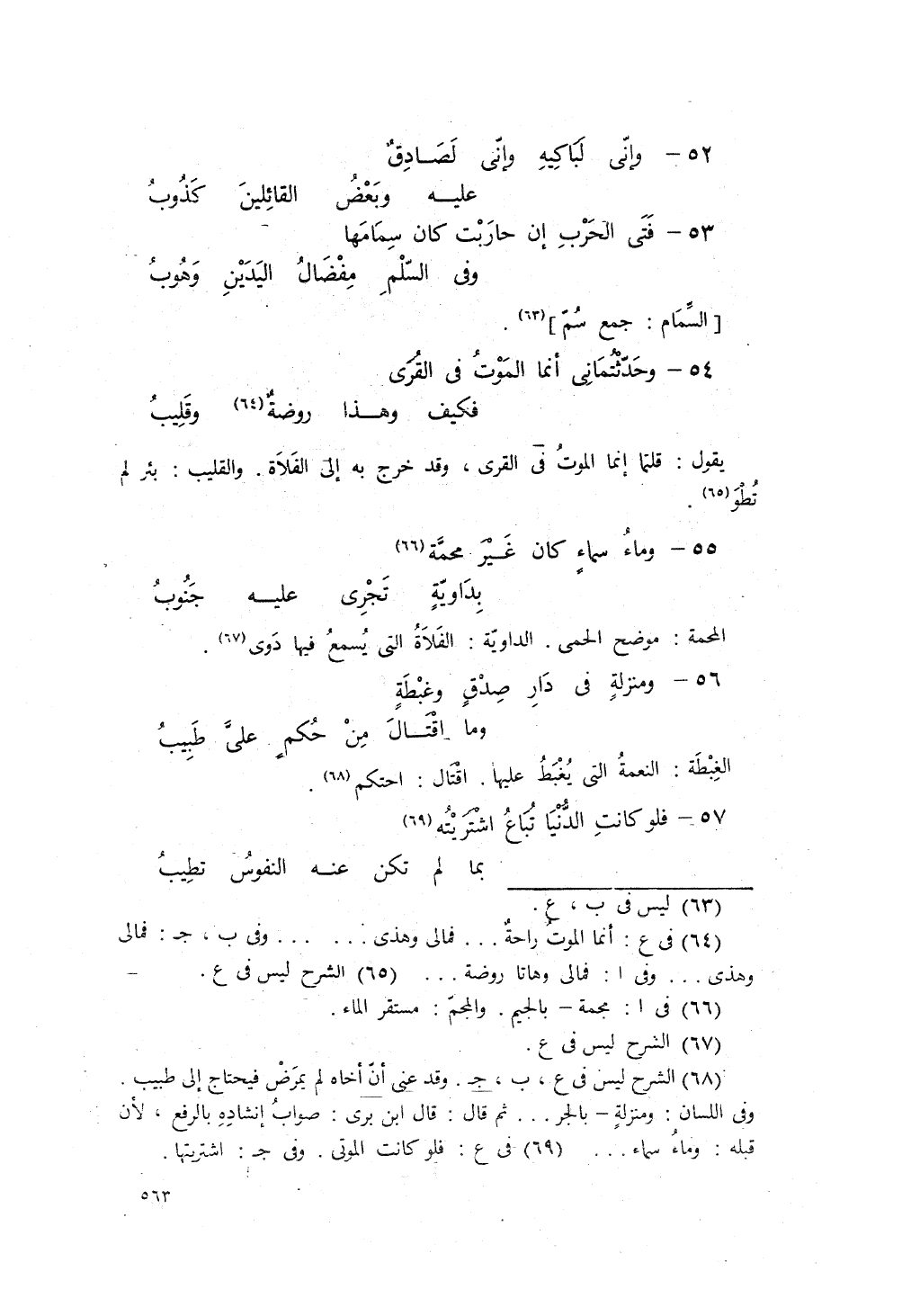 وَحَدَّثْتُمَاني إنَّمَا المَوْتُ في القُرَى، ... فَكَيْفَ؟ وَهذَا رَوْضَةٌ وَقَلَيْبُ