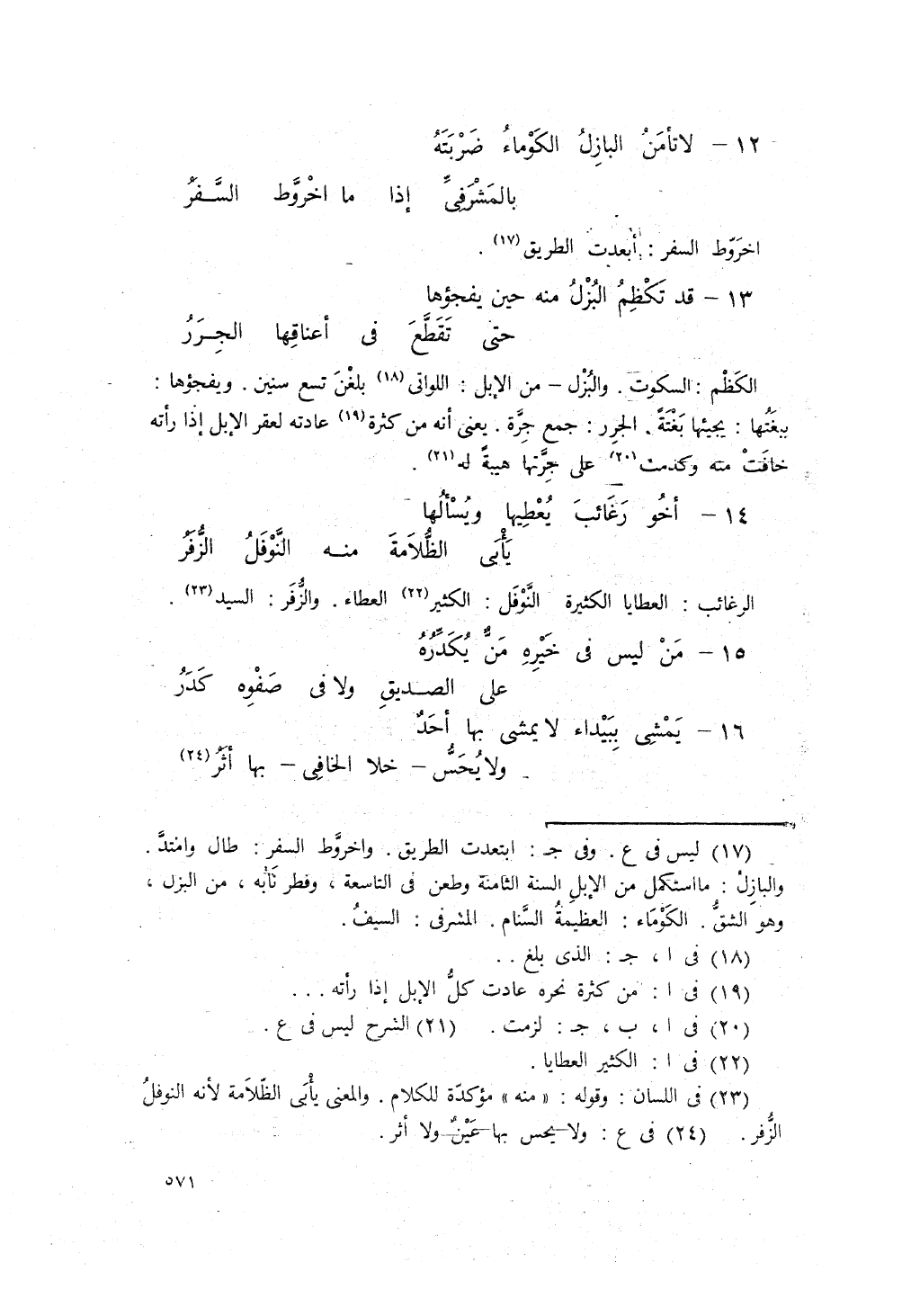 لا تَأْمَنُ البازلُ الكوماءُ ضَرْبَتَهُ ... بِالمَشْرَفيّ، إذا ما اخْرَوّطَ السّفَرُ