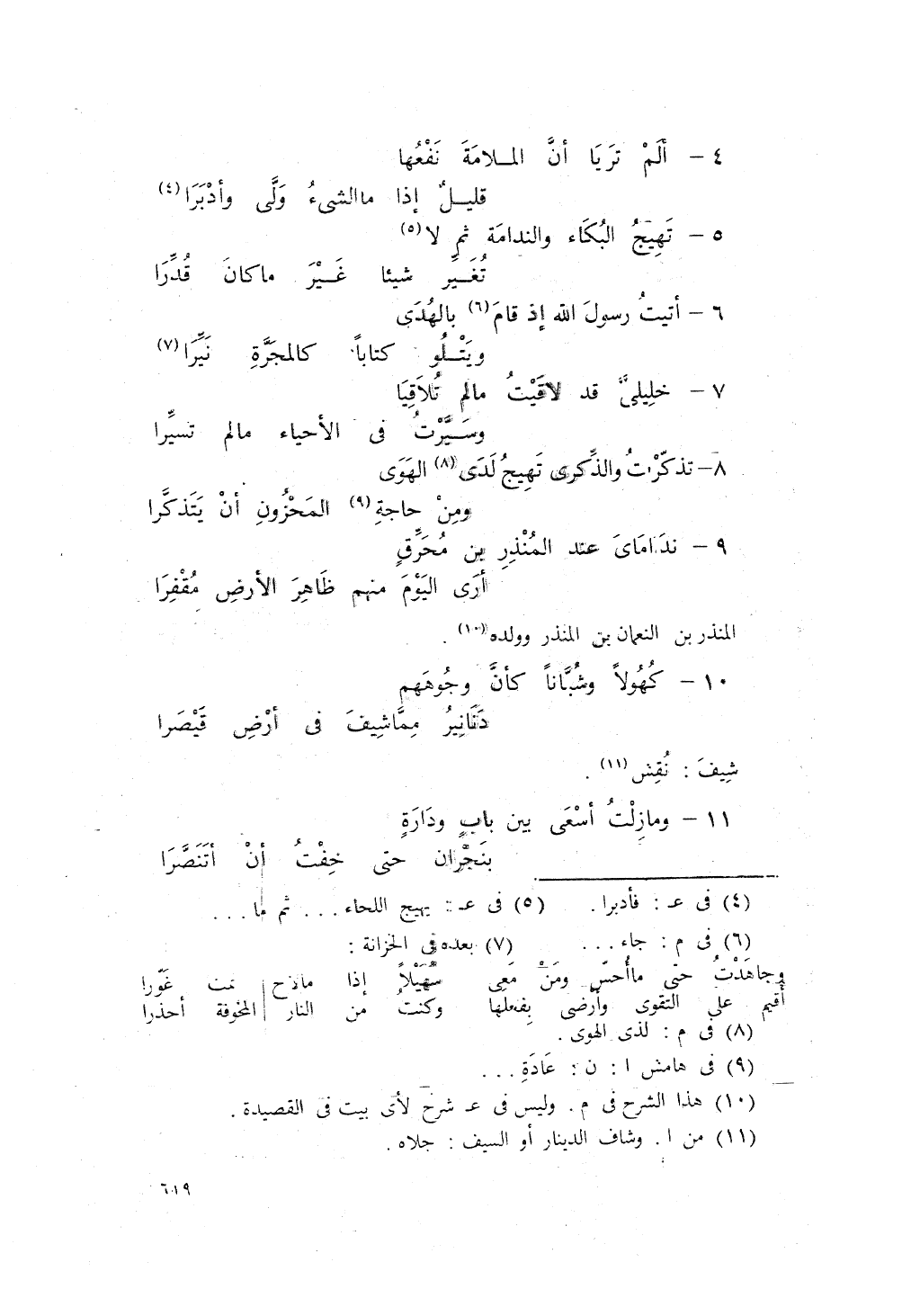 نَدامايَ عِنْدَ المُنْذِرِ بْن مُحرِّقٍ، ... أرى اليَوْمَ مِنْهُم ظاهر الأرض مقفرا