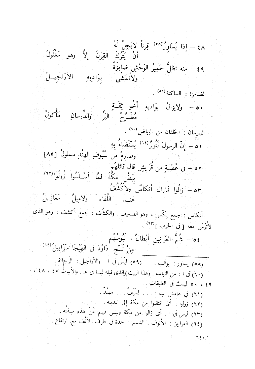 مِنْهُ تَظَلّ حَميرُ الوَحشِ ضَامِزَةً، ... ولاَ تُمَشَّى بِواديهِ الأراجِيل