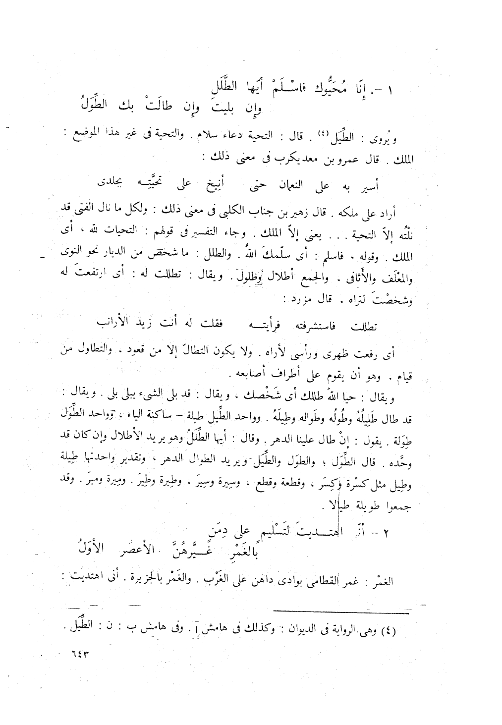 إنّا مُحيّوكَ، فاسلَم أَيُّها الطَّلَلُ، ... وإن بَلِيتَ، وإن طالتْ بكَ الطِّوَلُ