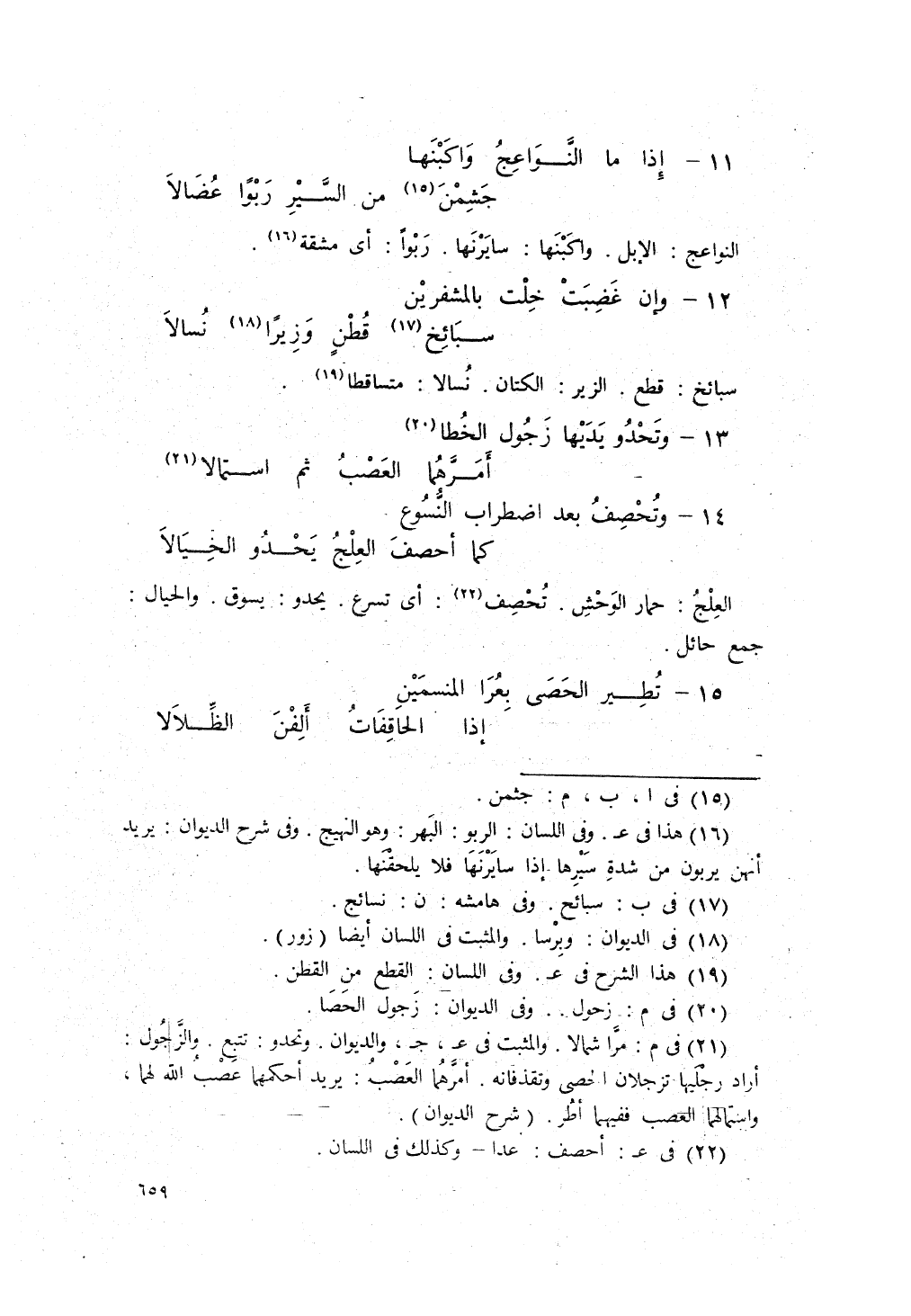 تُطِيرُ الحَصَى بِعُرى المَنْسِمَين، ... إذا الحاقِفَاتُ أَلِفْنَ الظِّلالا