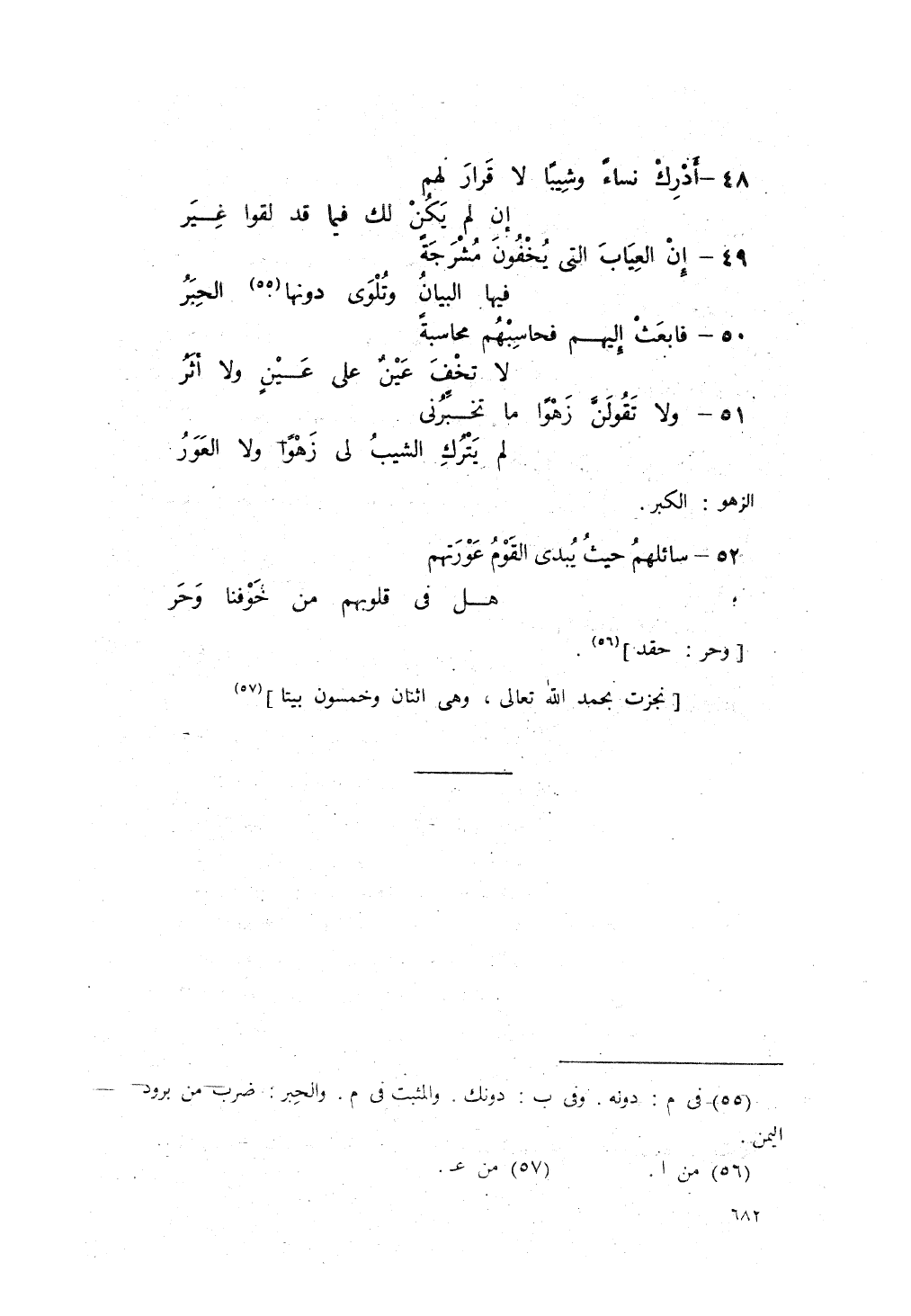 ولا تَقُولَنّ: زهواً ما تُخبِّرُني، ... لم يَتْركِ الشَيْبُ لي زهواً ولا العَوَرُ