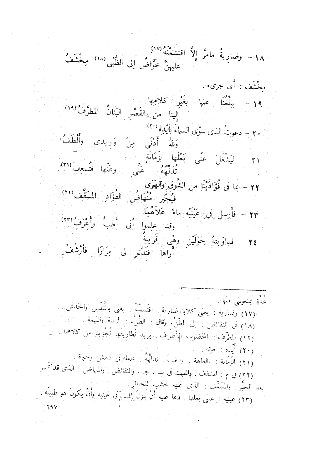يُبَلِّغُنَا عَنْهَا، بِغَيْرِ كَلاَمِها، ... إلينا، مِنَ القَصرِ البَنَانُ المُطرَّفُ