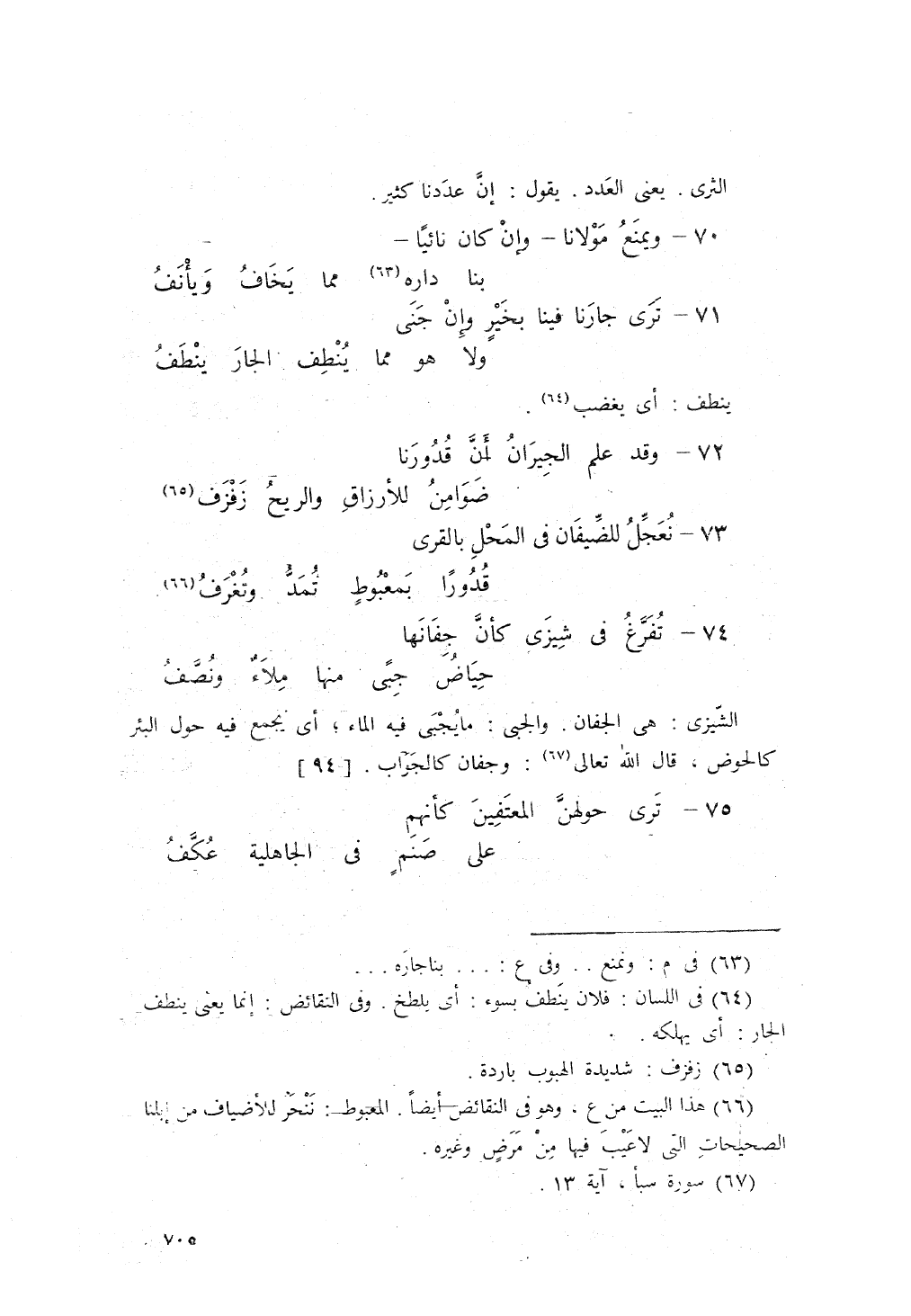 تَرَى جارَنَا فينا يُجِيرُ، وَإنْ جَنَى، ... وَلاَ هُوَ مِمّا يُنَظِفُ الجارَ يُنْظَفُ