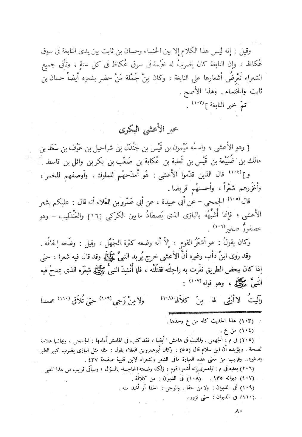 وذكر ابن دأب: أن الأعشى خرج يريد النبي، صلى الله عليه وسلم، فقال شعراً حتى إذا كان ببعض الطريق نفرت به راحلته، فقتلته، ولا أنشد شعره الذي يقول فيه: الطويل