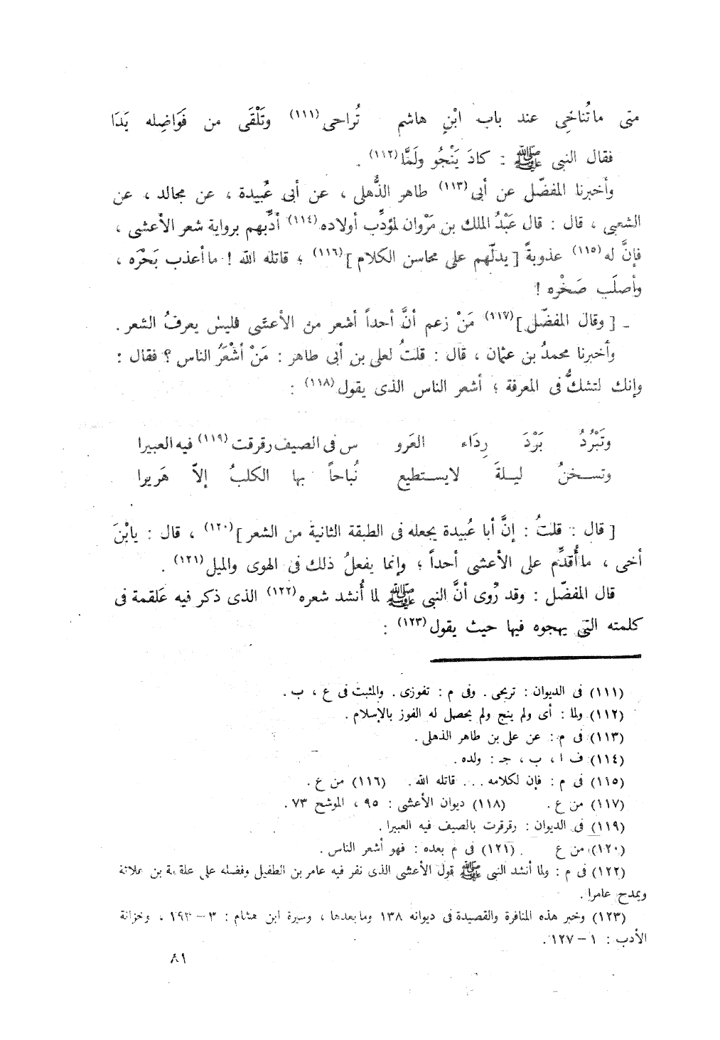 وقال: يا ابن أخي من قدم على الأعشى أحداً فإنما يفعل ذلك بالميل، فهو أشعر شعراء الناس. ولما أنشد النبي، صلى الله عليه وسلم، قول الأعشى الذي نفر فيه عامر بن الطفيل وفضله على علقمة بن علاثة ويمدح عامراً: