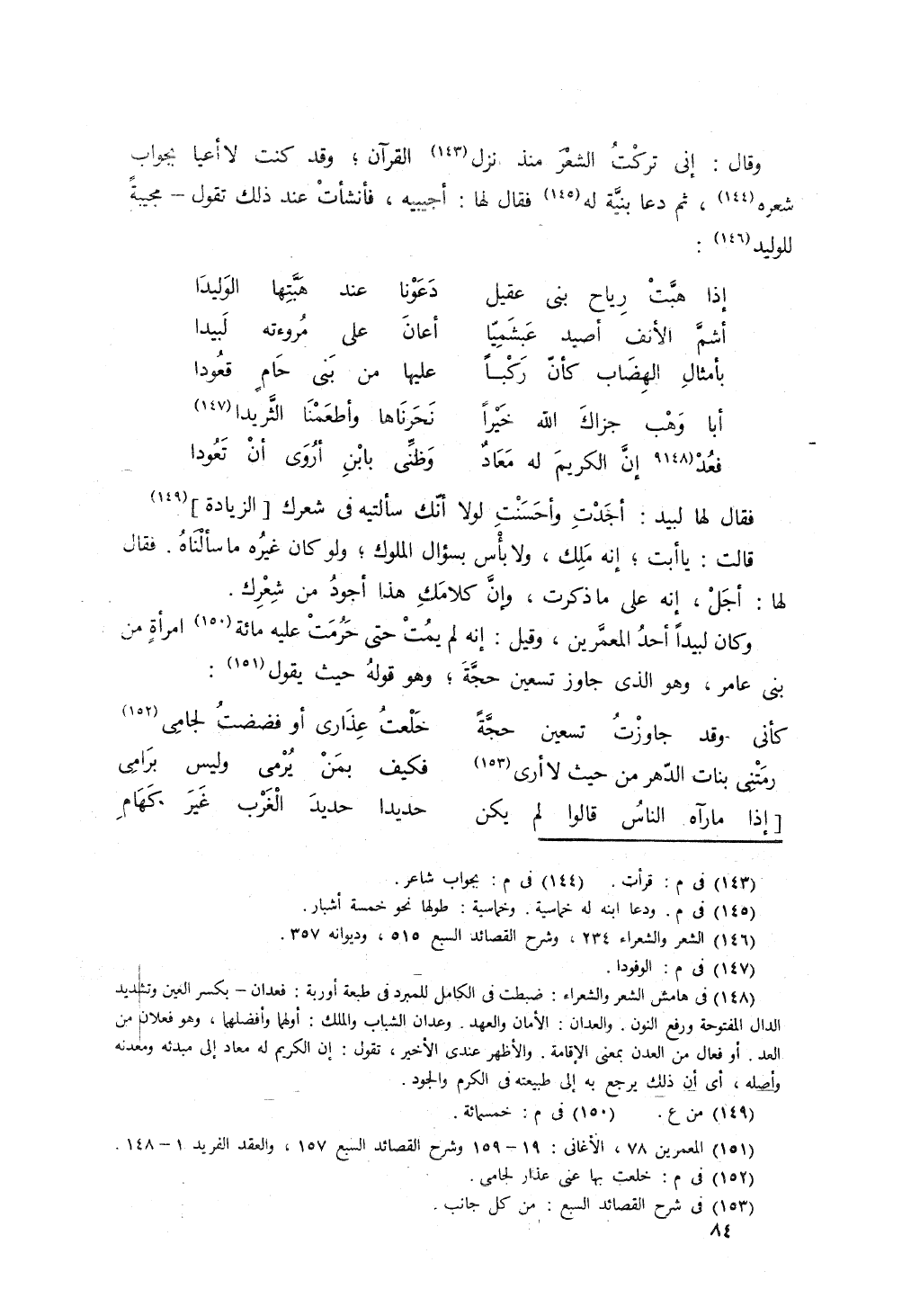 فقال لبيد: أجبت وأحسنت لولا أنك سألت في شعرك. قالت إنه أمير، وليس بسوقة ولا بأس بسؤاله، ولو كان غيره ما سألناه! قال: أجل! إنه لعلى ما ذكرت.