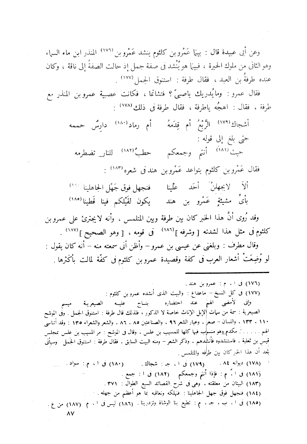 وقال مطرف: بلغني عن عيس بن عمر، وأظن أني قد سمعته منه، أنه كان يقول: لو وضعت أشعار العرب في كفة وقصيدة عمرو بن كلثوم في كفة لمالت بأكثرها.