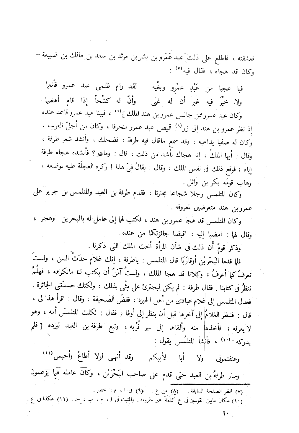 قال: فبينما عمرو بن هند قاعد، وعنده عبد عمرو، إذ نظر إلى خصر قميصه متخرقاً وكان من أجمل العرب، وكان صفياً له يداعبه، وقد سمع ما قال فيه طرفة، فضحك؛ وأنشده شعر طرفة، فقال: أيها الملك، قد هجاك بأشد من هذا. قال: وما هو؟ فأنشده قوله: فوقع في قلبه، وقال: يقول في مثل هذا؟ وكره العجلة عليه لمكان قومه، فكتب إلى عامله؛ وكان المتلمس، وهو عمرو ابن عبد المسيح، رجلاً مسناً مجرباً، وكان المتلمس أيضاً قد هجا عمراً، فأقبل المتلمس وطرفة على عمرو يتعرضان لمعروفه؛ فكتب لهما إلى عامل البحرين وهجر، وقال: إنطلقا إليه، فاقتضيا جوائزكما، فلما خرجا من عنده قال المتلمس: يا طرفة! إنك غلامٌ حديث السن، ولست تعرف ما أعرف، وكلانا قد هجاه، ولست آمن أن يكتب بما نكره، فتعال ننظر في كتبه! فقال طرفة: لم يكن ليقدم علي بمثل هذا، وعدل المتلمس إلى غلام عبادي من أهل الحيرة، فقال: إقرأ ما في هذه الصحيفة، فإذا فيها السوء فألقاها في النهر، وتبع طرفة يريد أن يرده، فلم يدركه.