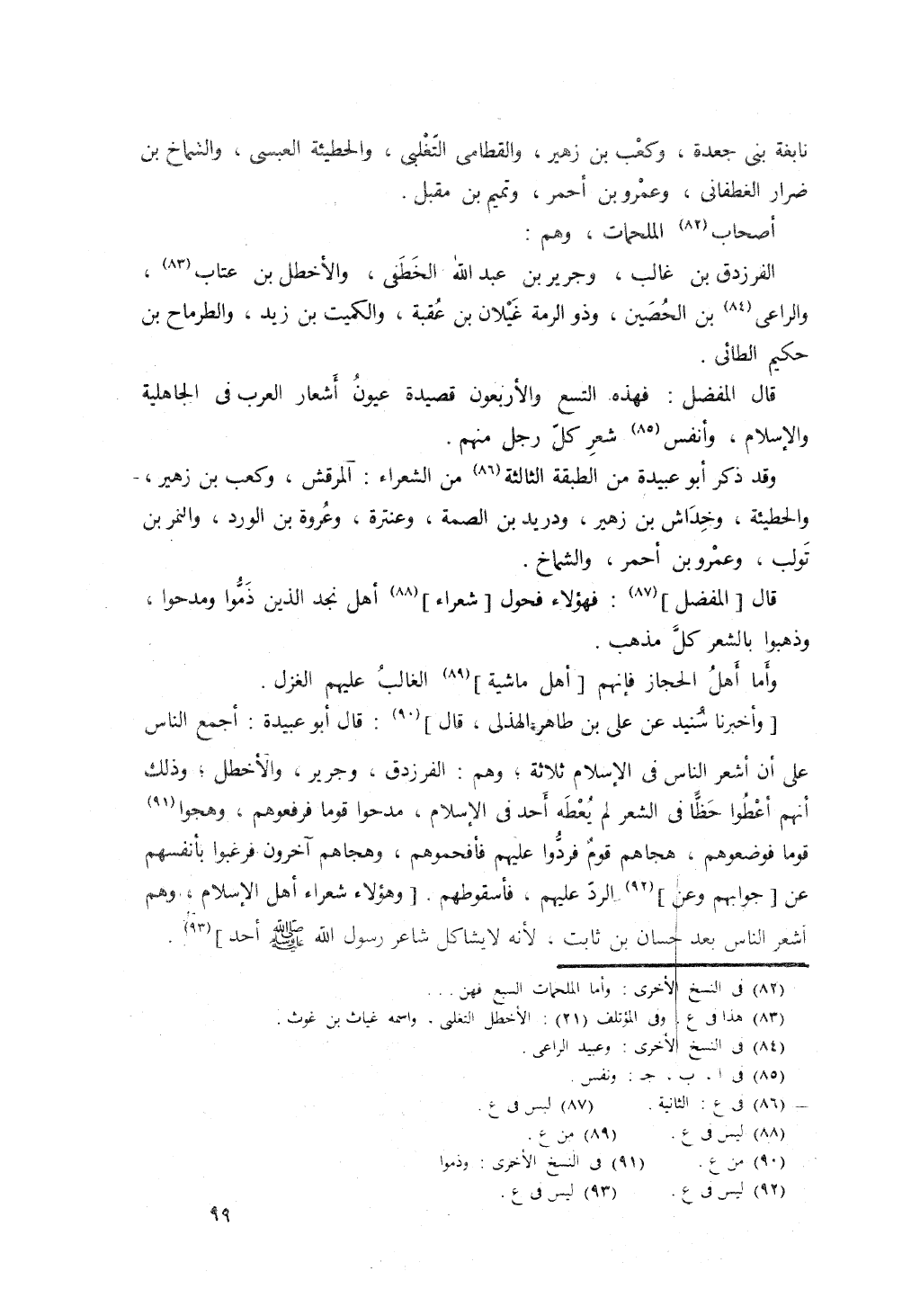 قال المفضل: هؤلاء فحول شعراء أهل نجد الذين ذموا ومدحوا، وذهبوا في الشعر كل مذهبٍ، فأما أهل الحجاز، فإنهم الغالب عليهم الغزل.