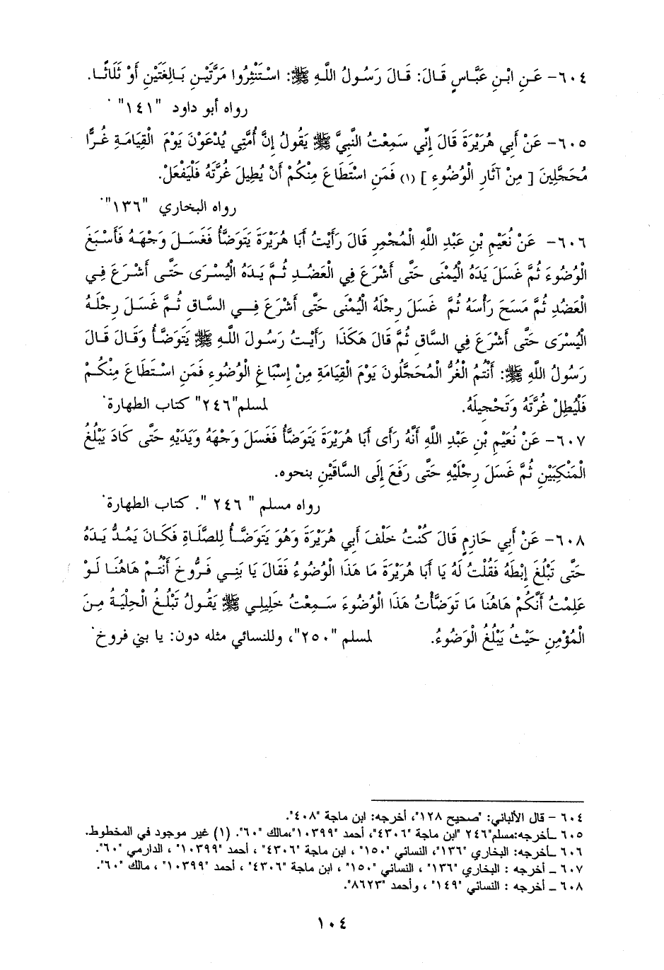 607 - وفي أخرى: أَنَّهُ رَأَى أَبَا هُرَيْرَةَ يَتَوَضَّأُ فَغَسَلَ وَجْهَهُ وَيَدَيْهِ حَتَّى كَادَ يَبْلُغُ الْمَنْكِبَيْنِ ثُمَّ غَسَلَ رِجْلَيْهِ حَتَّى رَفَعَ إِلَى السَّاقَيْنِ بنحوه (¬1) لمسلم.