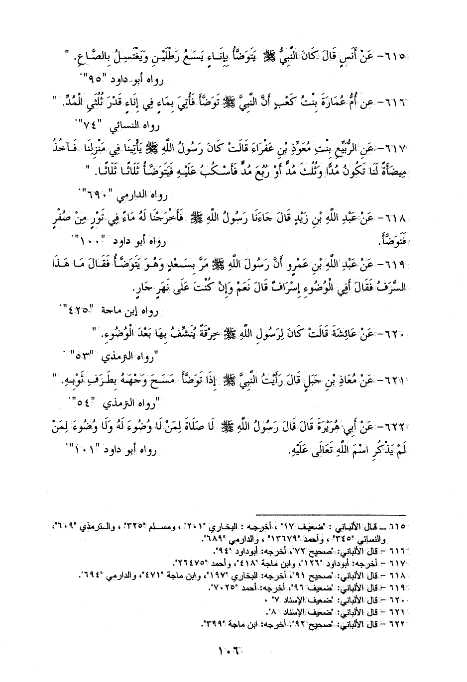 وضعفه الألباني في «ضعيف أبي داود» (14) وقال: والمعروف في هذا الحديث وغيره بلفظ يتوضأ بمكوك، وفي رواية: بمد؛ وهو المكوك أ. هـ.