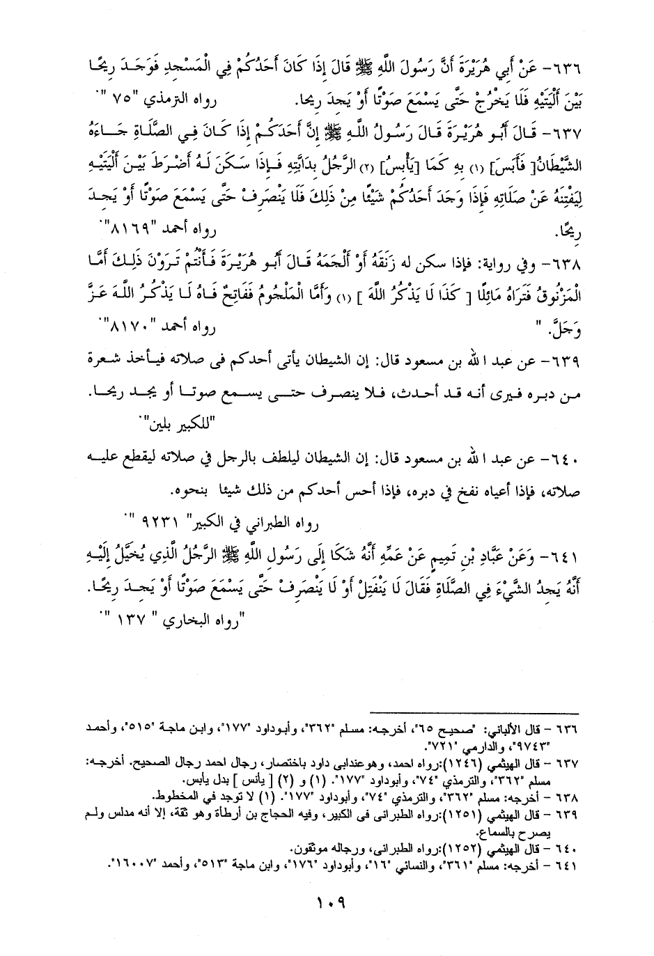 639 - ابن مسعود رفعه: ((إن الشيطان يأتى أحدكم فى صلاته فيأخذ شعرة من دبره، فيرى أنه قد أحدث فلا ينصرف حتى يسمع صوتا أو يجد ريحا)). للكبير بلين (¬1).