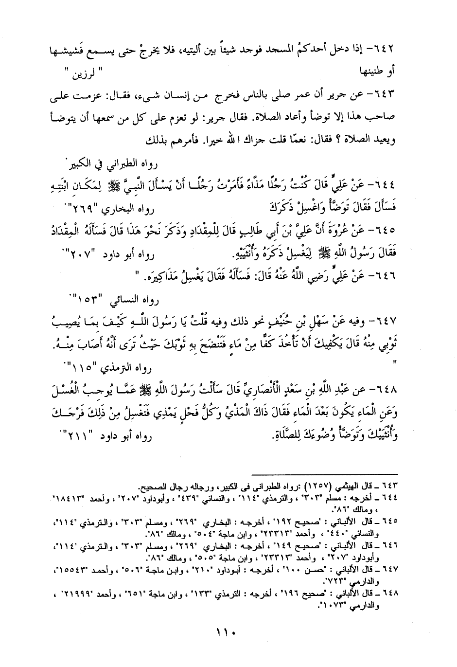 644 - عَلِيٍّ قَالَ: كُنْتُ رَجُلًا مَذَّاءً فاستحييت أن أسأل النَّبِيَّ - صلى الله عليه وسلم - لِمَكَانِ ابْنَتِهِ، فأمرت المقداد بن الأسود فَسَأَله فَقَالَ: ((يغْسِلْ ذَكَرَكَ ويتوضأ)). للستة (¬1).