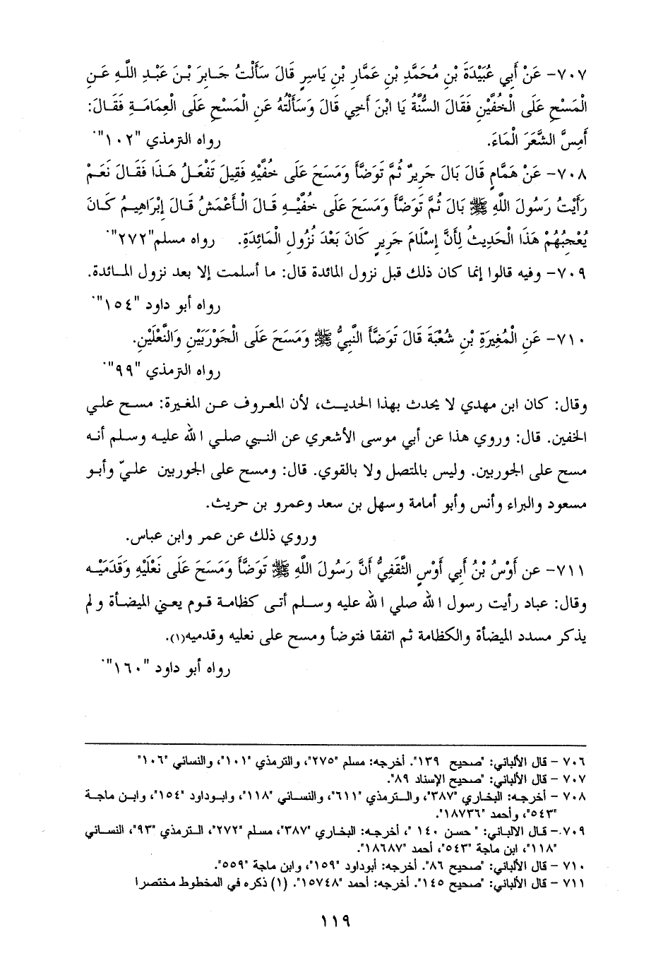 710 - الْمُغِيرَةِ: تَوَضَّأَ رسولُ الله - صلى الله عليه وسلم - وَمَسَحَ عَلَى الْجَوْرَبَيْنِ وَالنَّعْلَيْنِ. للترمذي وأبي داود وقال كان ابن مهدي لا يحدث بهذا الحديث لأن المعروف عن المغيرة مسح على الخفين قال وروي هذا عن أبي موسى الأشعري عن النبي - صلى الله عليه وسلم - أنه مسح على الجوربين وليس بالمتصل ولا بالقوي قال ومسح على الجوربين علي، وأبو مسعود والبراء وأنس وأبو أمامة وسهل بن سعد وعمرو بن حريث وروي ذلك عن عمرو وابن عباس (¬1).