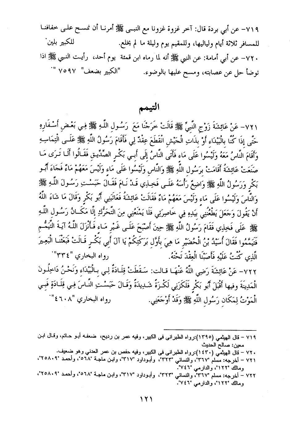 719 - أبو بردة قال: آخر غزوة غزونا مع النبى - صلى الله عليه وسلم - أمرنا أن نمسح على خفافنا للمسافر ثلاثة أيام بلياليهن، وللمقيم يوم وليلة ما لم يخلع. للكبير (¬1).