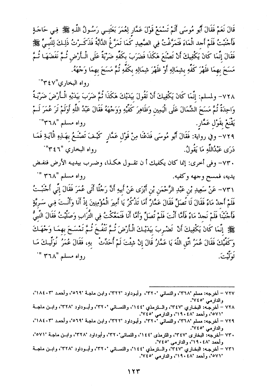728 - ولمسلم: ((إِنَّمَا كَانَ يَكْفِيكَ أَنْ تَقُولَ بِيَدَكَ هَكَذَا)). ثُمَّ ضَرَبَ بِيَدَيْهِ الْأَرْضَ ضَرْبَةً وَاحِدَةً ثُمَّ مَسَحَ الشِّمَالَ عَلَى الْيَمِينِ وَظَاهِرَ كَفَّيْهِ وَوَجْهَهُ فَقَالَ عَبْدُ الله أَوَلَمْ تَرَ عُمَرَ لَمْ يَقْنَعْ بِقَوْلِ عَمَّارٍ (¬1).