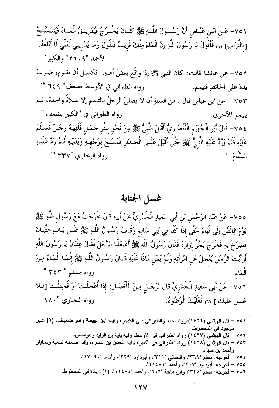 754 - أَبُو الْجُهَيْمِ: أَقْبَلَ النَّبِيُّ - صلى الله عليه وسلم - مِنْ نَحْوِ بِئْرِ جَمَلٍ فَلَقِيَهُ رَجُلٌ فَسَلَّمَ عَلَيْهِ فَلَمْ يَرُدَّ حَتَّى أَقْبَلَ عَلَى الْجِدَارِ فَمَسَحَ بِوَجْهِهِ وَيَدَيْهِ ثُمَّ رَدَّ عَلَيْهِ السَّلَامَ. للشيخين (¬1).