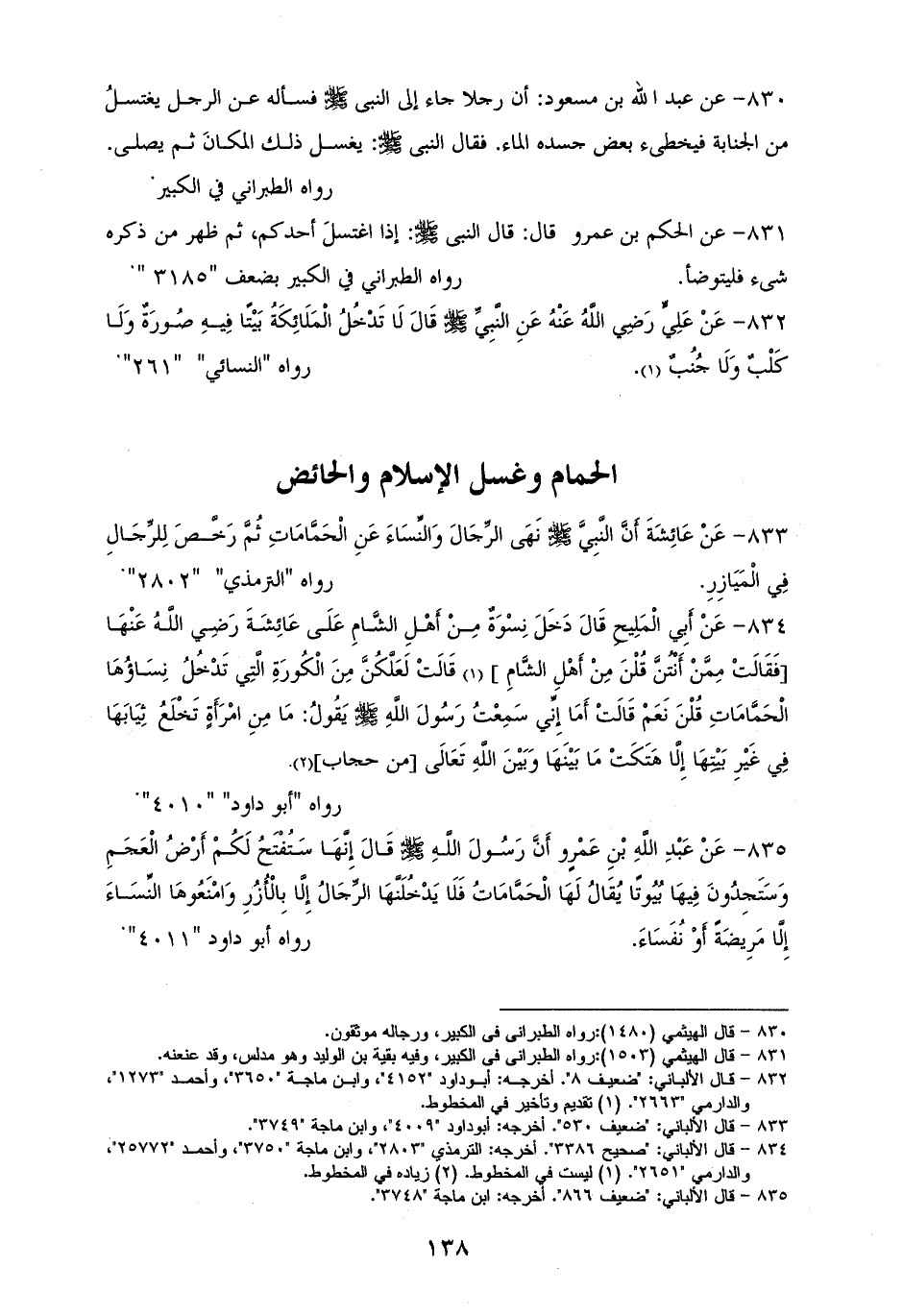 835 - ابْنِ عَمْرٍو بن العاص رفعه: ((سَتُفْتَحُ لَكُمْ أَرْضُ الْعَجَمِ، وَسَتَجِدُونَ فِيهَا بُيُوتًا، يُقَالُ لَهَا: الْحَمَّامَات فَلَا يَدْخُلَنَّهَا الرِّجَالُ إِلَّا بِأُزُرِ، وامنعوا منها النِّسَاءَ إِلَّا مَرِيضَةً أَوْ نُفَسَاءَ)). لأبي داود (¬1).
