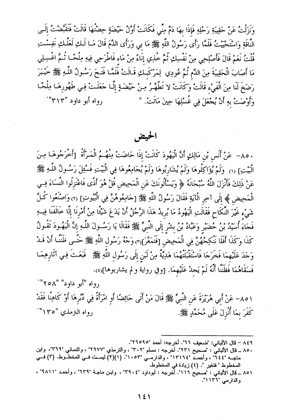 851 - أبو هُرَيْرَةَ رفعه: ((مَنْ أَتَى حَائِضًا في فرجها أَوِ امْرَأَةً فِي دُبُرِهَا أَوْ كَاهِنًا فَقَدْ كَفَرَ بِمَا أُنْزِلَ عَلَى مُحَمَّدٍ)). للترمذي (¬1).