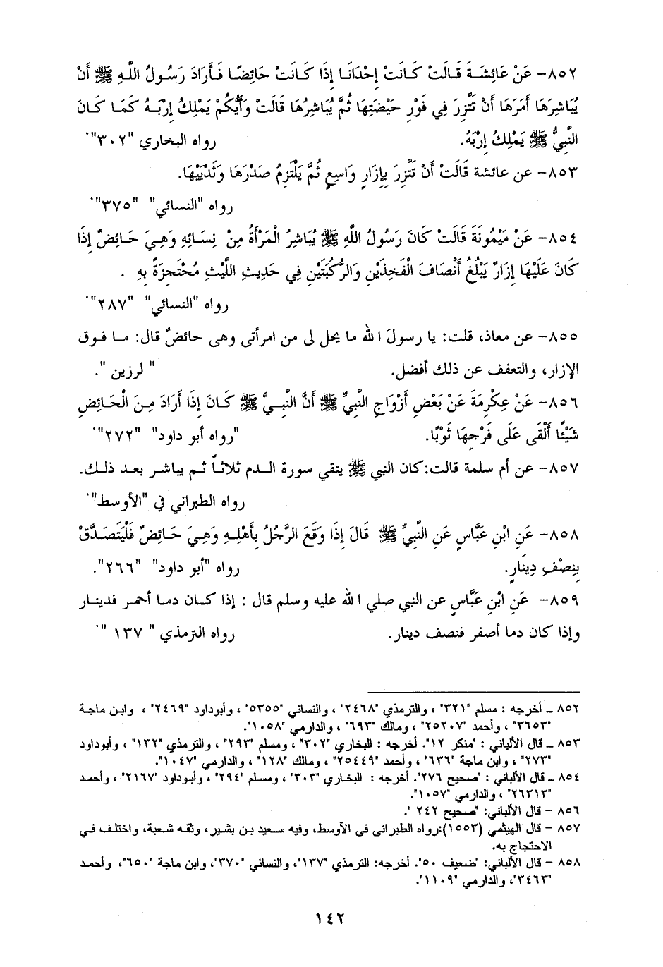852 - عَائِشَةُ: كَانَتْ إِحْدَانَا إِذَا كَانَتْ حَائِضًا، وأَرَادَ رَسُولُ الله - صلى الله عليه وسلم - أَنْ يُبَاشِرَهَا أَمَرَهَا أَنْ تأتزر بإزار فِي فَوْرِ حَيْضَتِهَا، ثُمَّ يُبَاشِرُهَا وَأَيُّكُمْ يَمْلِكُ إِرْبَهُ كَمَا كَانَ رسول الله - صلى الله عليه وسلم - يَمْلِكُ إِرْبَهُ. للستة بلفظ الشيخين (¬1).