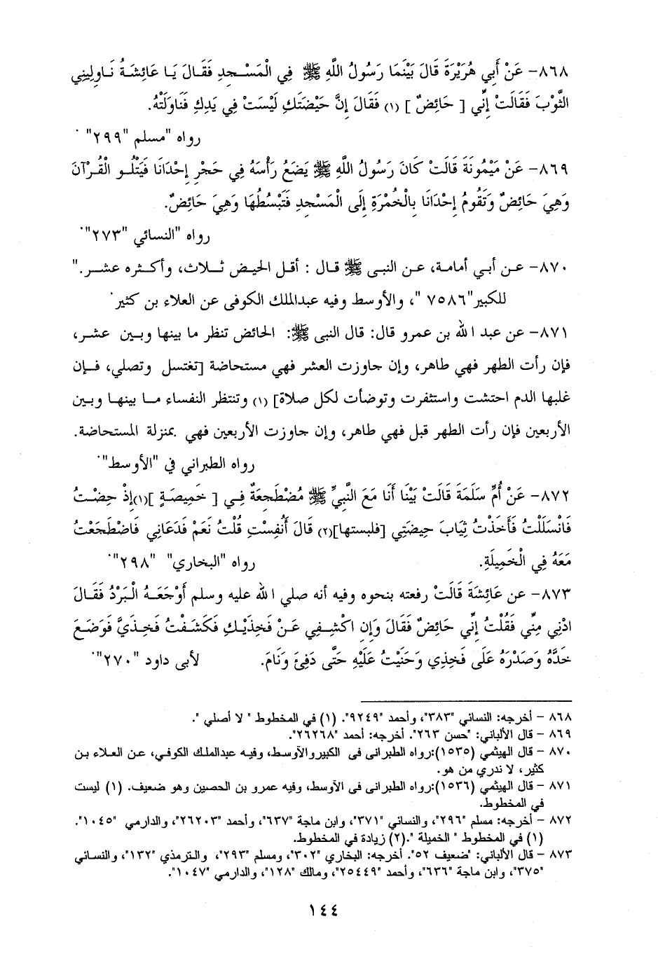 869 - مَيْمُونَةَ: كَانَ رَسُولُ الله - صلى الله عليه وسلم - يَضَعُ رَأْسَهُ فِي حَجْرِ إِحْدَانَا فَيَتْلُو الْقُرْآنَ وَهِيَ حَائِضٌ، وَتَقُومُ إِحْدَانَا بخمرته بِالْخُمْرَةِ إِلَى الْمَسْجِدِ فَتَبْسُطُهَا وَهِيَ حَائِضٌ. للنسائي (¬1).