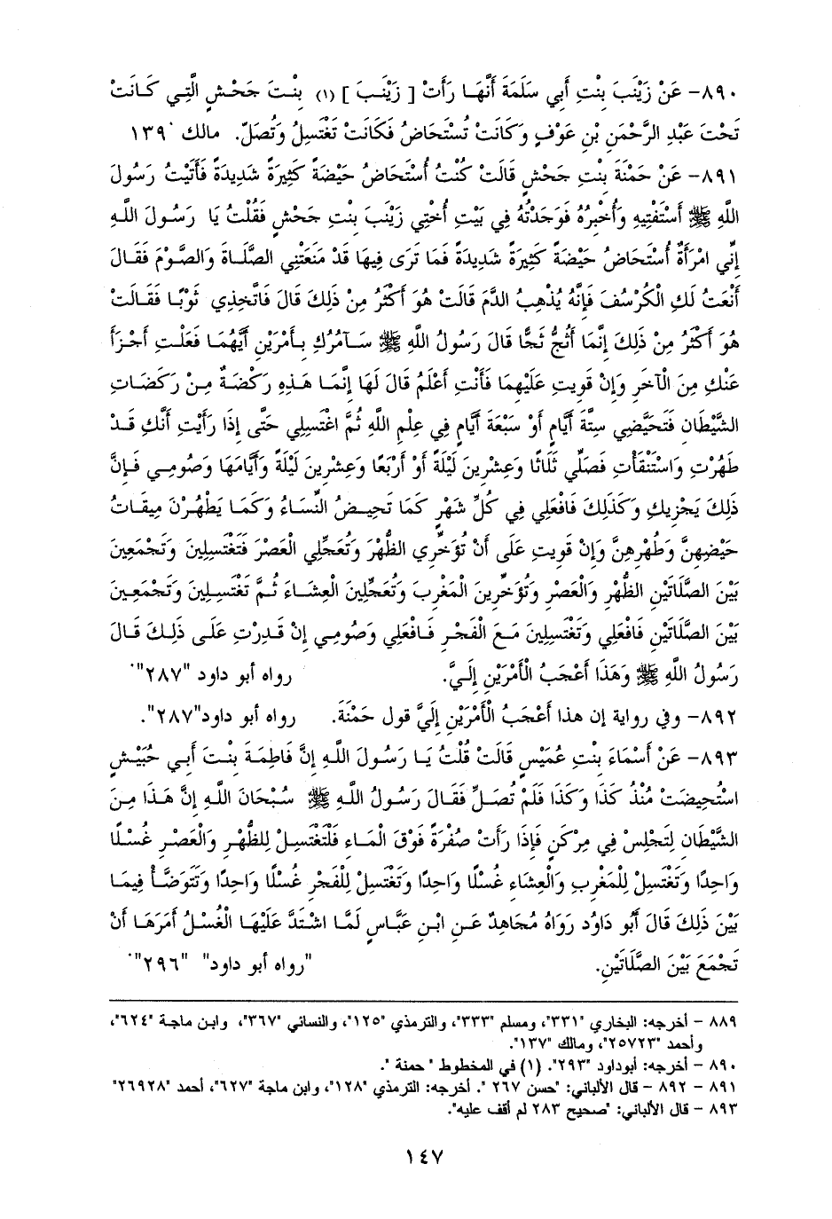 891 - حَمْنَةَ بِنْتِ جَحْشٍ: كُنْتُ أُسْتَحَاضُ حَيْضَةً كَثِيرَةً وشَدِيدَةً، فَأَتَيْتُ رَسُولَ الله - صلى الله عليه وسلم - أَسْتَفْتِيهِ وَأُخْبِرُهُ، فَوَجَدْتُهُ فِي بَيْتِ أُخْتِي زَيْنَبَ بِنْتِ جَحْشٍ، فَقُلْتُ: يَا رَسُولَ الله! إِنِّي أُسْتَحَاضُ حَيْضَةً كَثِيرَةً شَدِيدَةً فَمَا تَرَى فِيهَا قَدْ مَنَعَتْنِي الصَّلَاةَ وَالصَّوْمَ؟ قَالَ: ((أَنْعَتُ لَكِ الْكُرْسُفَ، فَإِنَّهُ يُذْهِبُ الدَّمَ)) قَالَتْ: هُوَ أَكْثَرُ مِنْ ذَلِكَ. قَالَ ((فَاتَّخِذِي ثَوْبًا)) قَالَتْ: هُوَ أَكْثَرُ مِنْ ذَلِكَ إِنَّمَا أَثُجُّ ثَجًّا. قَالَ: ((سَآمُرُكِ بِأَمْرَيْنِ أَيَّهُمَا فَعَلْتِ أَجْزَأَ عَنْكِ مِنَ الْآخَرِ، وَإِنْ قَوِيتِ عَلَيْهِمَا فَأَنْتِ أَعْلَمُ)) قَالَ لَهَا: ((إِنَّمَا هَذِهِ رَكْضَةٌ مِنْ رَكَضَاتِ الشَّيْطَانِ، فَتَحَيَّضِي سِتَّةَ أَيَّامٍ أَوْ سَبْعَةَ أَيَّامٍ فِي عِلْمِ الله، ثُمَّ اغْتَسِلِي حَتَّى إِذَا رَأَيْتِ أَنَّكِ قَدْ طَهُرْتِ، وَاسْتَنْقَأْتِ فَصَلِّي ثَلَاثًا وَعِشْرِينَ لَيْلَةً -أَوْ أَرْبَعًا وَعِشْرِينَ لَيْلَةً- وَأَيَّامَهَا وَصُومِي فَإِنَّ ذَلِكَ يَجْزِيكِ، وَكَذَلِكَ فَافْعَلِي فِي كُلِّ شَهْرٍ كَمَا تَحِيضُ النِّسَاءُ، وَكَمَا يَطْهُرْنَ لمِيقَاتِ حَيْضِهِنَّ وَطُهْرِهِنَّ، وَإِنْ قَوِيتِ عَلَى أَنْ تُؤَخِّرِي الظُّهْرَ وَتُعَجِّلِي الْعَصْرَ وتَغْتَسِلِينَ، وَتَجْمَعِينَ بَيْنَ الصَّلَاتَيْنِ الظُّهْرِ وَالْعَصْرِ، وَتُؤَخِّرِينَ الْمَغْرِبَ وَتُعَجِّلِينَ الْعِشَاءَ، ثُمَّ تَغْتَسِلِينَ وَتَجْمَعِينَ بَيْنَ الصَّلَاتَيْنِ فَافْعَلِي، وَتَغْتَسِلِينَ مَعَ الْفَجْرِ فَافْعَلِي وَصُومِي إِنْ قَدِرْتِ عَلَى ذَلِكَ)) قَالَ رَسُولُ الله - صلى الله عليه وسلم -: ((وَهَذَا أَعْجَبُ الْأَمْرَيْنِ إِلَيَّ)).
