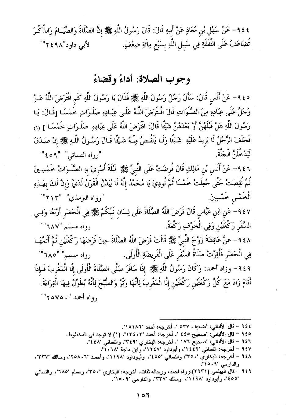 949 - زاد أحمد: وَكَانَ - صلى الله عليه وسلم - إِذَا سَافَرَ صَلَّى الصَّلَاةَ الْأُولَى إِلَّا الْمَغْرِبَ، وإِذَا أَقَامَ زَادَ مَعَ كُلِّ رَكْعَتَيْنِ رَكْعَتَيْنِ إِلَّا الْمَغْرِبَ؛ لِأَنَّهَا وَتْرٌ، وَالصُّبْحَ؛ لِأَنَّهُا يُطَوِّلُ فِيهَا الْقِرَاءَةَ (¬1).