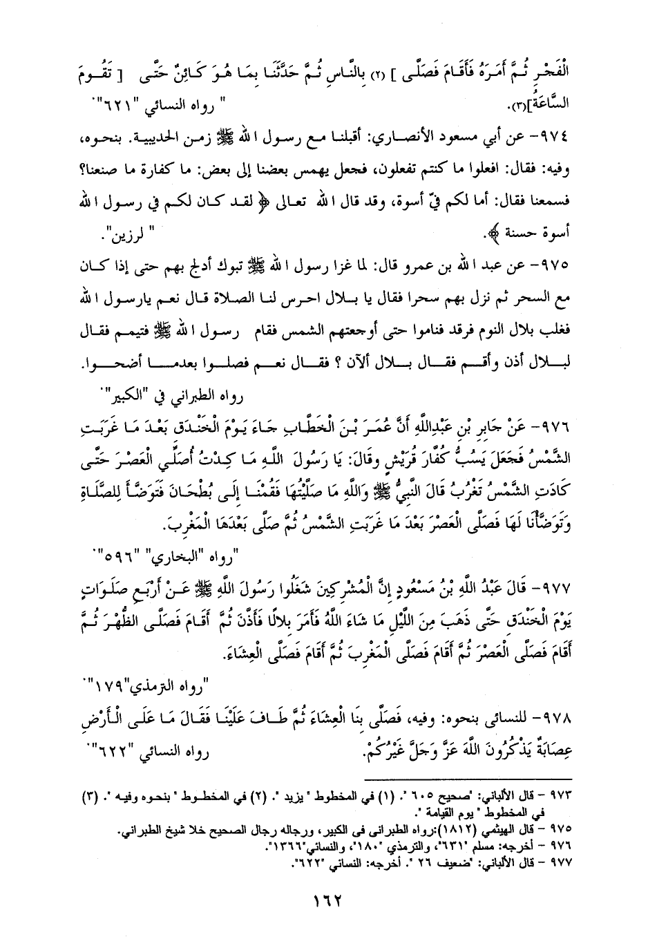 977 - ابْنُ مَسْعُودٍ: إِنَّ الْمُشْرِكِينَ شَغَلُوا رَسُولَ الله - صلى الله عليه وسلم - عَنْ أَرْبَعِ صَلَوَاتٍ يَوْمَ الْخَنْدَقِ، حَتَّى ذَهَبَ مِنَ اللَّيْلِ مَا شَاءَ الله، فَأَمَرَ بِلالًا فَأَذَّنَ، ثُمَّ أَقَامَ فَصَلَّى الظُّهْرَ، ثُمَّ أَقَامَ فَصَلَّى الْعَصْرَ، ثُمَّ أَقَامَ فَصَلَّى الْمَغْرِبَ، ثُمَّ أَقَامَ فَصَلَّى الْعِشَاءَ. للترمذي (¬1).