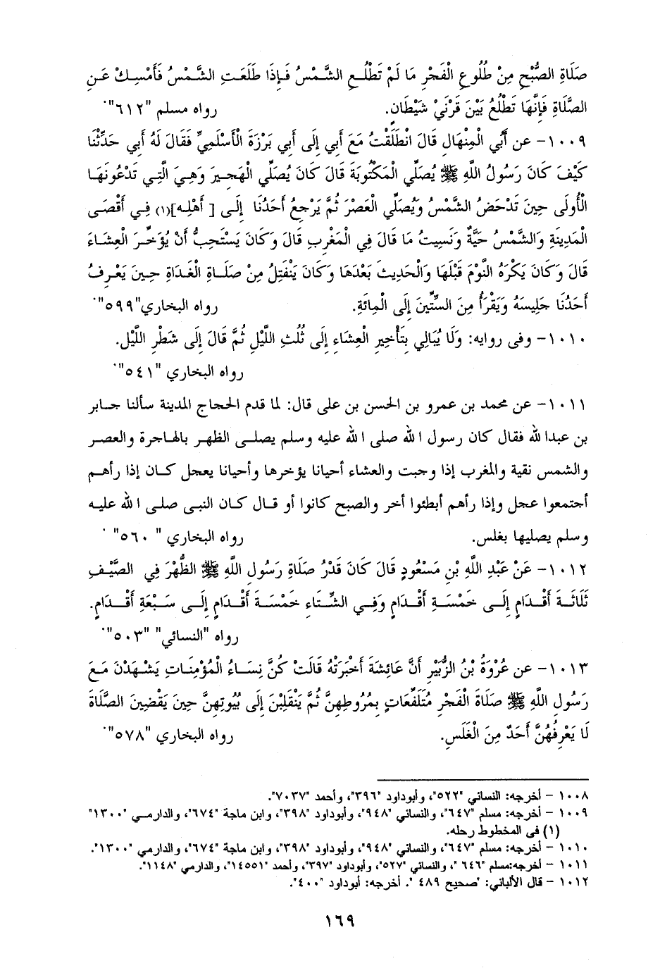 1011 - محمد بن عمرو بن الحسن بن على بن أبي طالب: كان الحجاج يؤخر الصلوات فسألنا جابرًا فقال كان رسول الله - صلى الله عليه وسلم - يصلى الظهر بالهاجرة، والعصر والشمس نقيةٌ، والمغرب إذا وجبت الشمس، والعشاء أحيانا يؤخرها وأحيانا يعجل، إذا رآهم أجتمعوا عجل وإذا رآهم أبطئوا أخر، والصبح كان يصليها بغلس. هما للشيخين وأبي داود والنسائي (¬1).