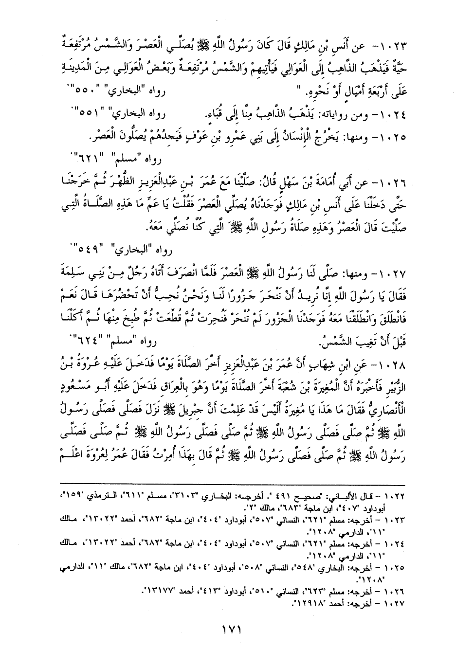 1023 - أَنَسِ: كَانَ رَسُولُ الله - صلى الله عليه وسلم - يُصَلِّي الْعَصْرَ وَالشَّمْسُ مُرْتَفِعَةٌ حَيَّةٌ، فَيَذْهَبُ الذَّاهِبُ إِلَى الْعَوَالِي فَيَأْتِيهِمْ وَالشَّمْسُ مُرْتَفِعَةٌ، وَبَعْضُ الْعَوَالِي مِنَ الْمَدِينَةِ عَلَى أَرْبَعَةِ أَمْيَالٍ. للستة إلا الترمذي (¬1).