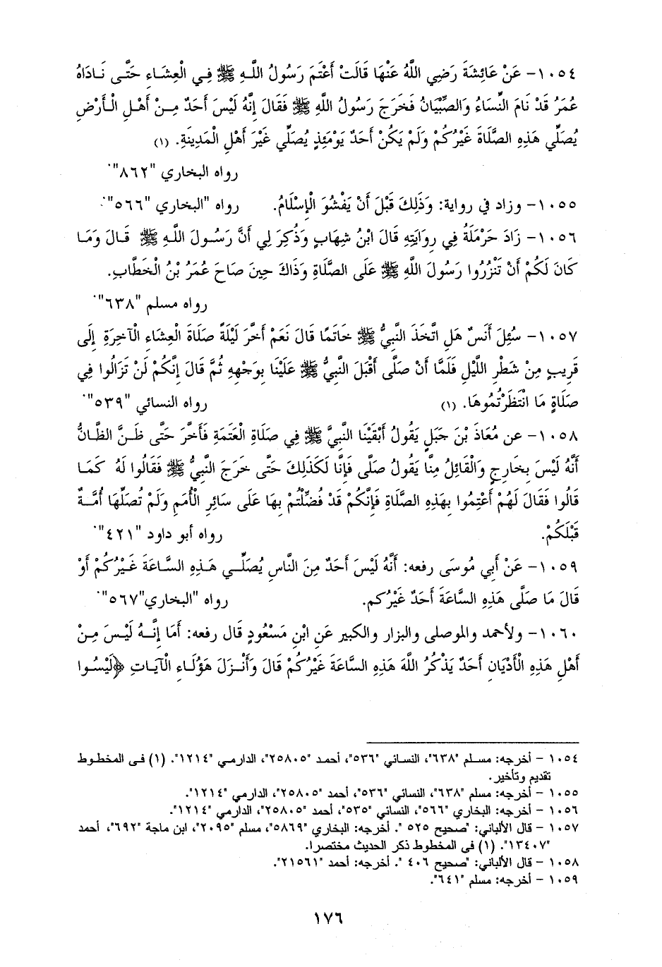 1058 - ولأبي داود عن مُعَاذٍ: بينا ننتظر النَّبِيَّ - صلى الله عليه وسلم -، وقد تأخر لصَلَاةِ الْعَتَمَةِ حَتَّى ظَنَّ الظَّانُّ أَنَّهُ لَيْسَ بِخَارِجٍ، ويقول الْقَائِلُ مِنَّا: إنه قد صَلَّى فَإِنَّا لَكَذَلِكَ إذ خَرَجَ فَقَالُوا لَهُ كَمَا قَالُوا، فَقَالَ: ((أَعْتِمُوا بِهَذِهِ الصَّلَاةِ فَإِنَّكُمْ قَدْ فُضِّلْتُمْ بِهَا عَلَى سَائِرِ الْأُمَمِ لَمْ تُصَلِّهَا أُمَّةٌ قَبْلَكُمْ)) (¬1).