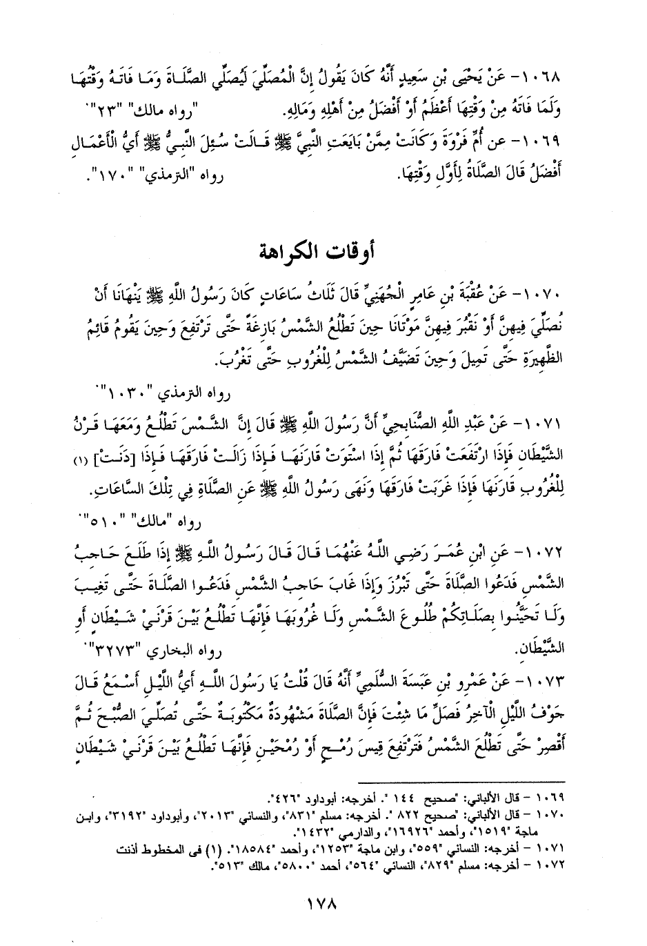 1070 - عُقْبَةَ بْنِ عَامِرٍ: ثَلَاثُ سَاعَاتٍ كَانَ رَسُولُ الله - صلى الله عليه وسلم - يَنْهَانَا أَنْ نُصَلِّيَ فِيهِنَّ أَوْ نَقْبُرَ فِيهِنَّ مَوْتَانَا: حِينَ تَطْلُعُ الشَّمْسُ بَازِغَةً حَتَّى تَرْتَفِعَ، وَحِينَ يَقُومُ قَائِمُ الظَّهِيرَةِ حَتَّى تَمِيلَ الشمسُ، وَحِينَ تَضَيَّفُ الشَّمْسُ لِلْغُرُوبِ حَتَّى تَغْرُبَ. لمسلم، وأصحاب السنن (¬1).