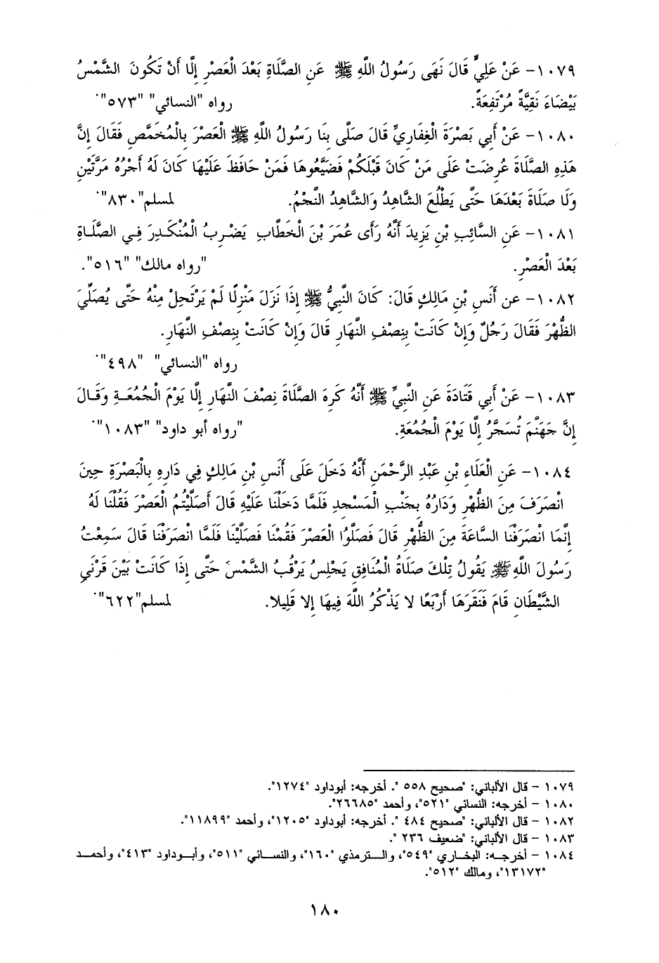 1084 - الْعَلَاءِ بْنِ عَبْدِ الرَّحْمَنِ: دَخَلَ عَلَى أَنَسِ فِي دَارِهِ بِالْبَصْرَةِ حِينَ انْصَرَفَ مِنَ الظُّهْرِ وَدَارُهُ بِجَنْبِ الْمَسْجِدِ، فقَالَ: أَصَلَّيْتُمُ الْعَصْرَ، قلت: إِنَّمَا انْصَرَفْنَا السَّاعَةَ مِنَ الظُّهْرِ، قَالَ: فَصَلَّوُا الْعَصْرَ فَقُمْنَا فَصَلَّيْنَا فَلَمَّا انْصَرَفْنَا، قَالَ: سَمِعْتُ رَسُولَ الله - صلى الله عليه وسلم -. يَقُولُ: ((تِلْكَ صَلَاةُ الْمُنَافِقِ يَجْلِسُ يَرْقُبُ الشَّمْسَ حَتَّى إِذَا كَانَتْ بَيْنَ قَرْنَيِ شَّيْطَانِ قَامَ فَنَقَرَهَا أَرْبَعًا لا يَذْكُرُ الله فِيهَا إِلا قَلِيلاً)). للستة إلا البخاري (¬1).