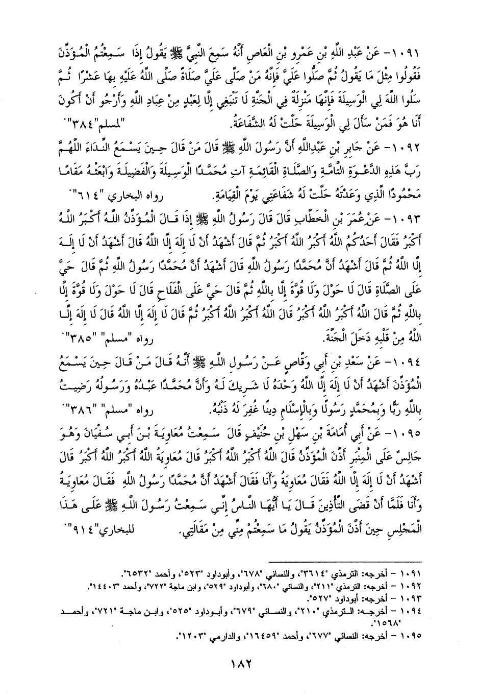 1091 - ابْن عَمْرِو بْنِ الْعَاصِ رفعه: ((إِذَا سَمِعْتُمُ النداء فَقُولُوا مِثْلَ مَا يَقُولُ، ثُمَّ صَلُّوا عَلَيَّ فَإِنَّ مَنْ صَلَّى عَلَيَّ صَلَاةً صَلَّى الله عَلَيْهِ بِهَا عَشْرًا، ثُمَّ سَلُوا الله لِي الْوَسِيلَةَ فَإِنَّهَا مَنْزِلَةٌ فِي الْجَنَّةِ لَا تَنْبَغِي إِلَّا لِعَبْدٍ مِنْ عِبَادِ الله وَأَرْجُو أَنْ أَكُونَ أَنَا هُوَ فَمَنْ سَأَلَ لِي الْوَسِيلَةَ حَلَّتْ لَهُ الشَّفَاعَةُ)). لمسلم وأصحاب السنن (¬1).