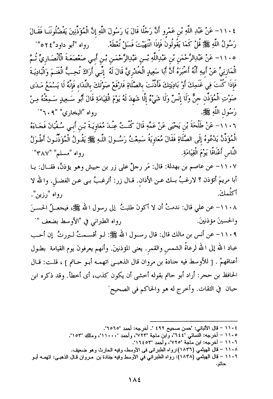 1109 - أنس رفعه: ((لو أقسمتُ لبررتُ إن أحب عباد الله إلى الله لرعاةُ الشمسِ والقمرِ -يعنى: المؤذنينَ- وأنهم ليعرفونَ يوم القيامة بطول أعناقهمْ)). للأوسط وفيه جنادة بن مروان، قال الذهبى: اتهمه أبو حاتم، قلت: قال الحافظ بن حجر: أراد أبو حاتم بقوله: أخشى أن يكون كذب، أى أخطأ. وقد ذكره ابن حبان في «الثقات». وأخرج له هو والحاكم فى «الصحيح» (¬1).