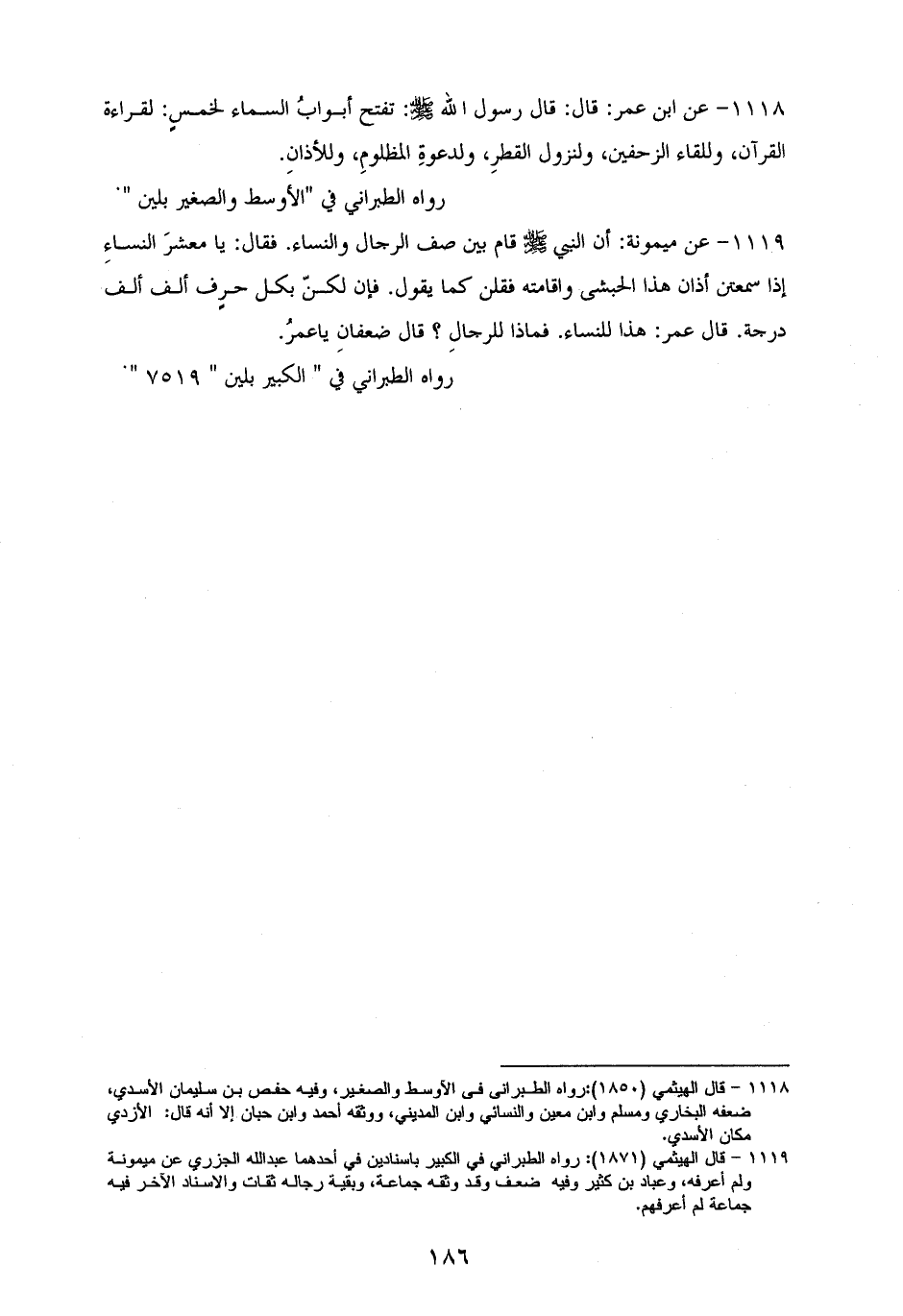 1118 - ابن عمر: تفتح أبوابُ السماء لخمسٍ: لقراءة القرآن، وللقاء الزحفين، ولنزول القطرِ، ولدعوةِ المظلومِ، وللأذانِ. للأوسط والصغير بلين (¬1).