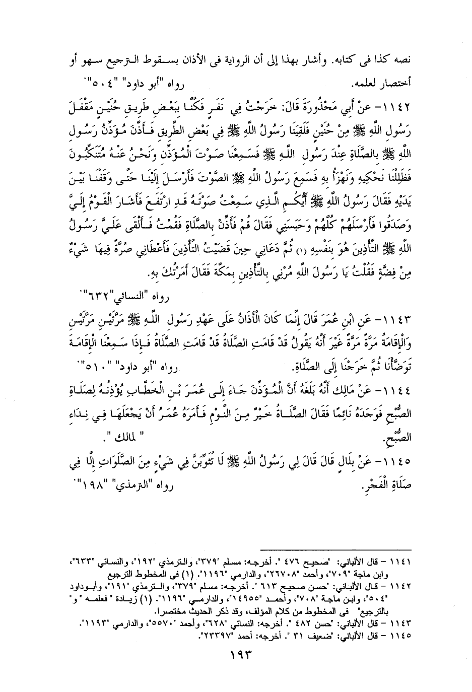 1145 - بِلَالٍ رفعه: ((لا تثويب فِي شَيْءٍ مِنَ الصَّلَوَاتِ إِلَّا فِي صَلَاةِ الْفَجْرِ)). للترمذي (¬1).