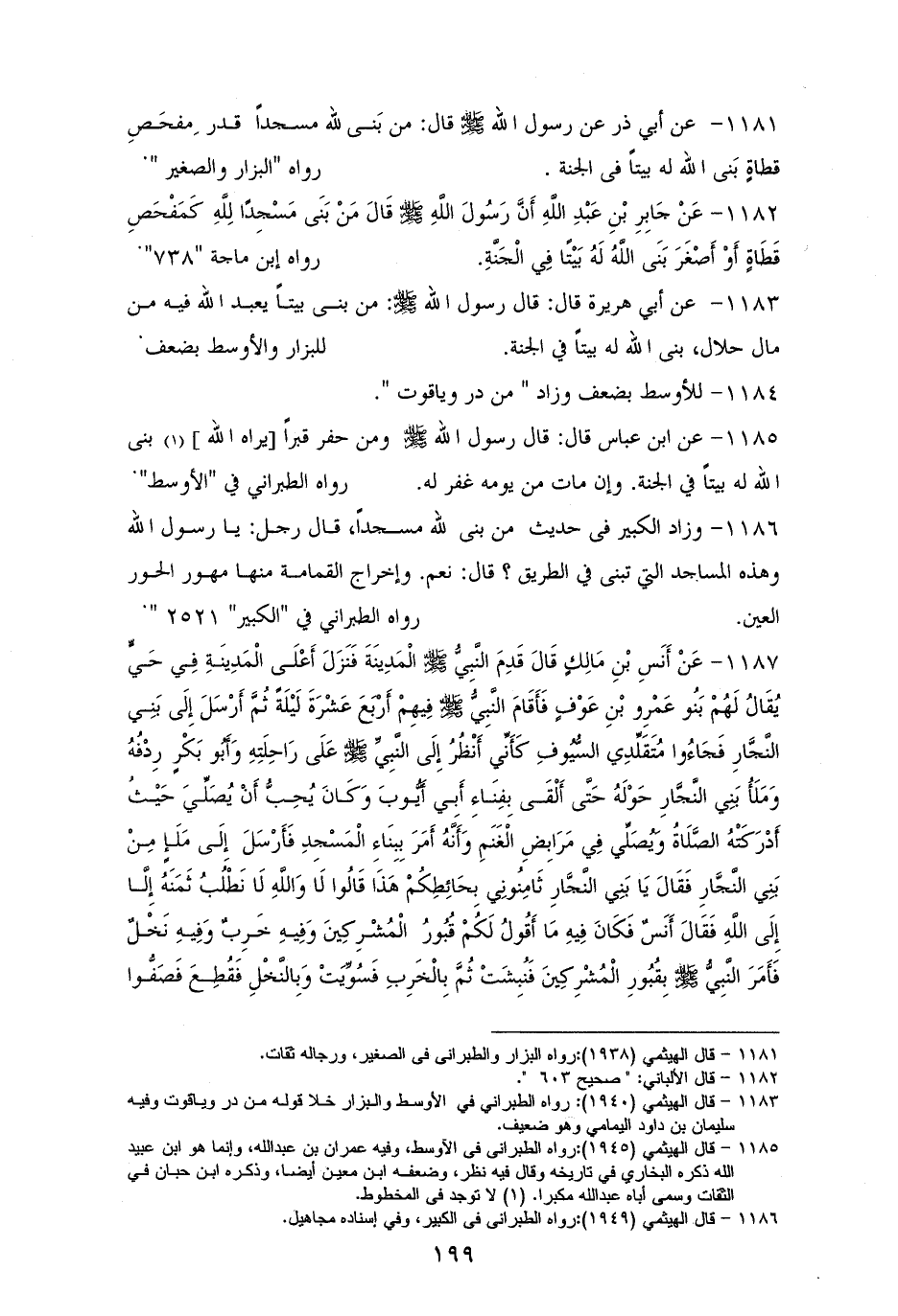 1183 - أبو هريرة رفعه: ((من بنى بيتاً يعبد الله فيه من مال حلال، بنى الله له بيتاً في الجنة)). للبزار، والأوسط بضعف (¬1).