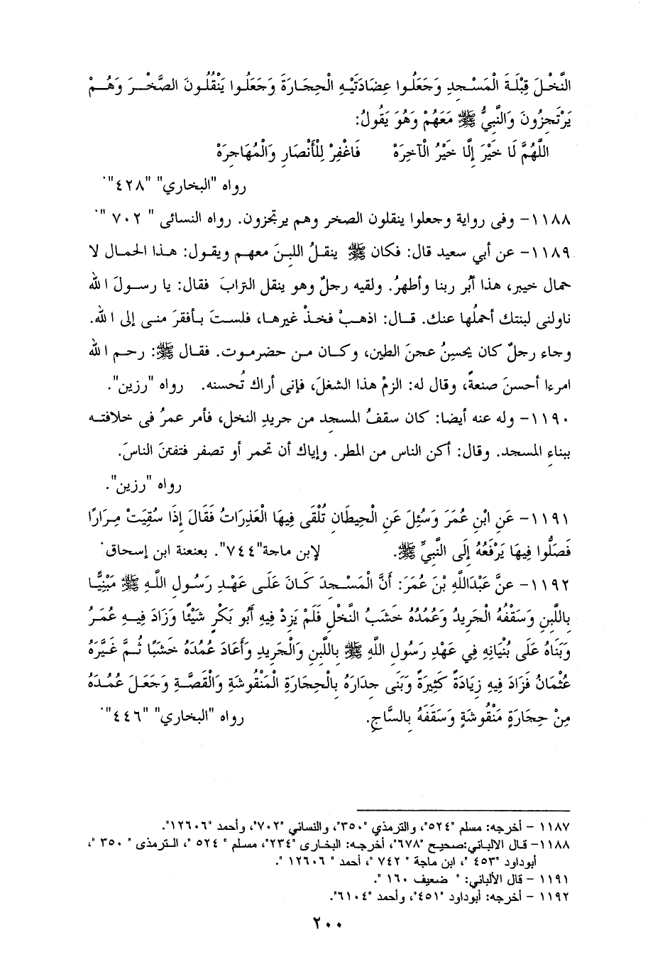 1192 - (وعنه): كان الْمَسْجِدُ عَلَى عَهْدِ رَسُولِ الله - صلى الله عليه وسلم - مَبْنِيًّا بِاللَّبِنِ وَسَقْفُهُ بالْجَرِيدِ وَعُمُدَهُ خَشَبُ النَّخْلِ فَلَمْ يَزِدْ فِيهِ أَبُو بَكْرٍ شَيْئًا، وَزَادَ فِيهِ عُمَرُ وَبَنَاهُ عَلَى بنائه فِي عَهْدِه - صلى الله عليه وسلم - بِاللَّبِنِ وَالْجَرِيدِ، وَأَعَادَ عُمُدَهُ خَشَبًا، ثُمَّ غَيَّرَهُ عثْمَانُ. وزَادَ فِيهِ زِيَادَةً كَثِيرَةً وَبَنَى جُدُرَهُ بِالْحِجَارَةِ الْمَنْقُوشَةِ وَالْقَصَّةِ، وَجَعَلَ عُمُدَهُ مِنْ حِجَارَةٍ مَنْقُوشَةٍ وَسَقَفُهُ بِالسَّاجِ. للبخاري، وأبي داود (¬1).
