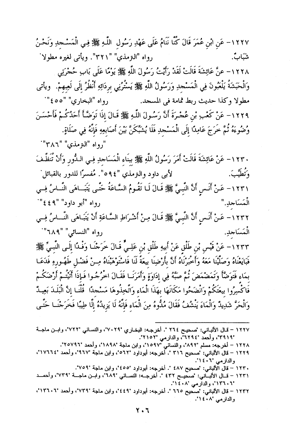 1230 - عَائِشَةُ: أَمَرَ رَسُولُ الله - صلى الله عليه وسلم - بِبِنَاءِ الْمَسجِدِ فِي الدُّورِ وَأَنْ يُنَظَّفَ وَيُطَيَّبَ. لأبي داود، والترمذيِّ. مُفسرًا للدور بالقبائل (¬1).