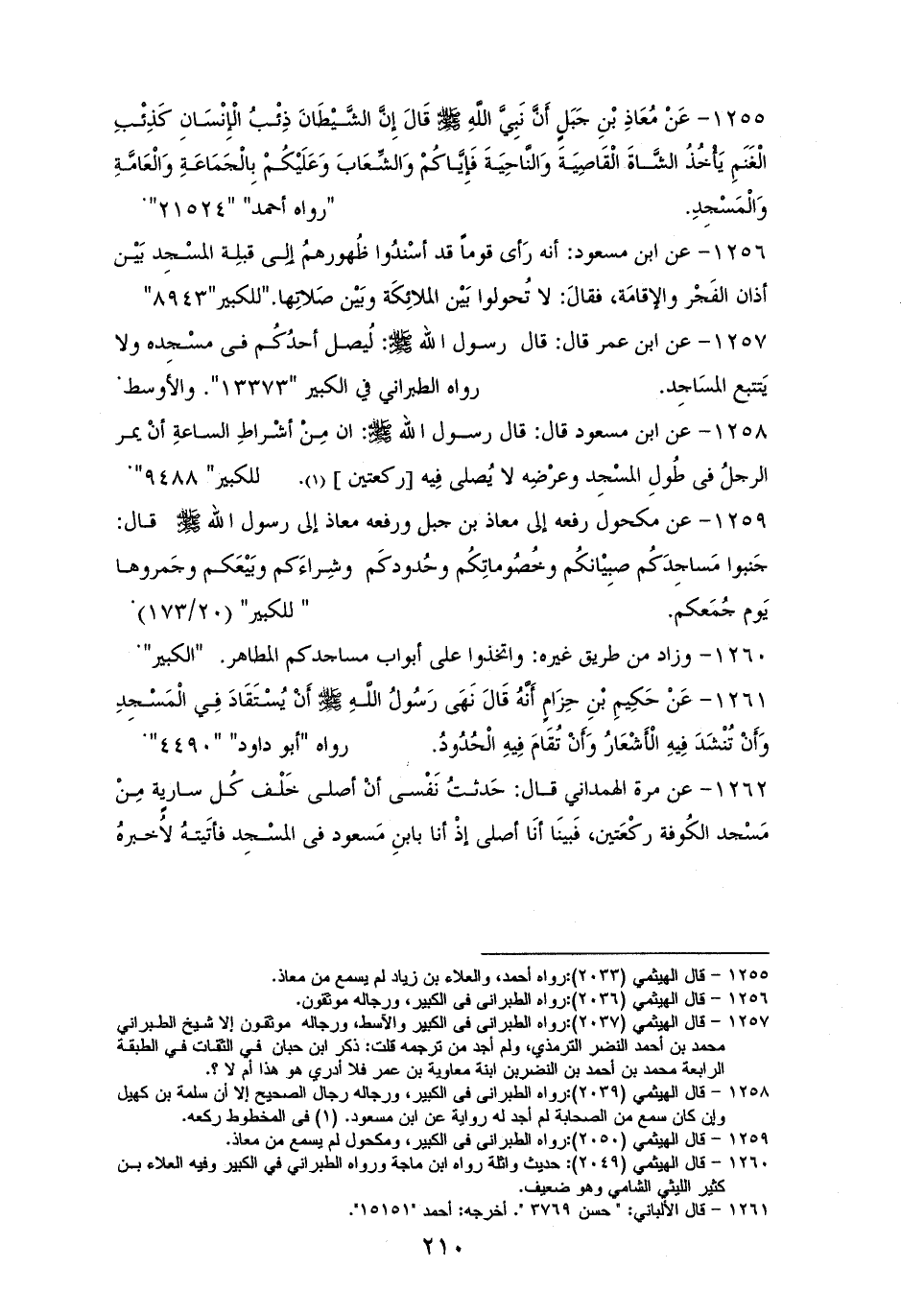 1259 - (مكحول عن معاذ) رفعه: ((جَنبوا مَساجِدَكُم صبِيْانكُم وخُصُوماتِكُم وحُدودكَم وشِراءَكم وبَيْعَكم وجَمروها يَوم جُمَعكم)). للكبير (¬1).