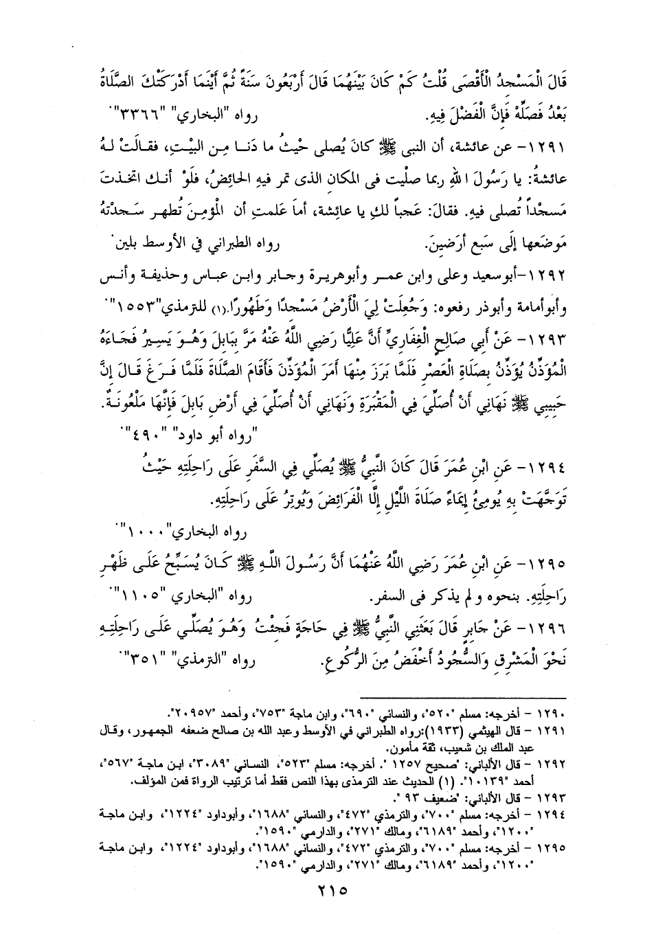 1294 - (ابْنِ عُمَرَ): كَانَ رسول الله - صلى الله عليه وسلم - يصَلِّي فِي السَّفَرِ عَلَى رَاحِلَتِهِ حَيْثُ تَوَجَّهَتْ بِهِ يُومِئُ إِيمَاءً صَلَاةَ اللَّيْلِ إِلَّا الْفَرَائِضَ وَيُوتِرُ عَلَى رَاحِلَتِهِ. للستة بلفظ البخاري (¬1).