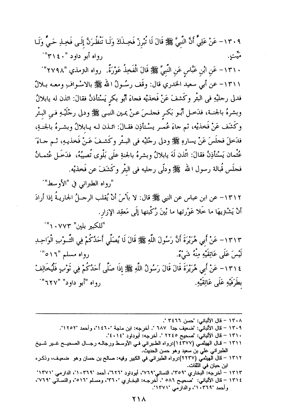 1309 - (علي) رفعه: يا عليُّ لَا تُبْرِزْ فَخِذَكَ وَلَا تَنْظُر إِلَى فَخِذِ حَيٍّ وَلَا مَيِّتٍ (¬1). لأبي داودَ.