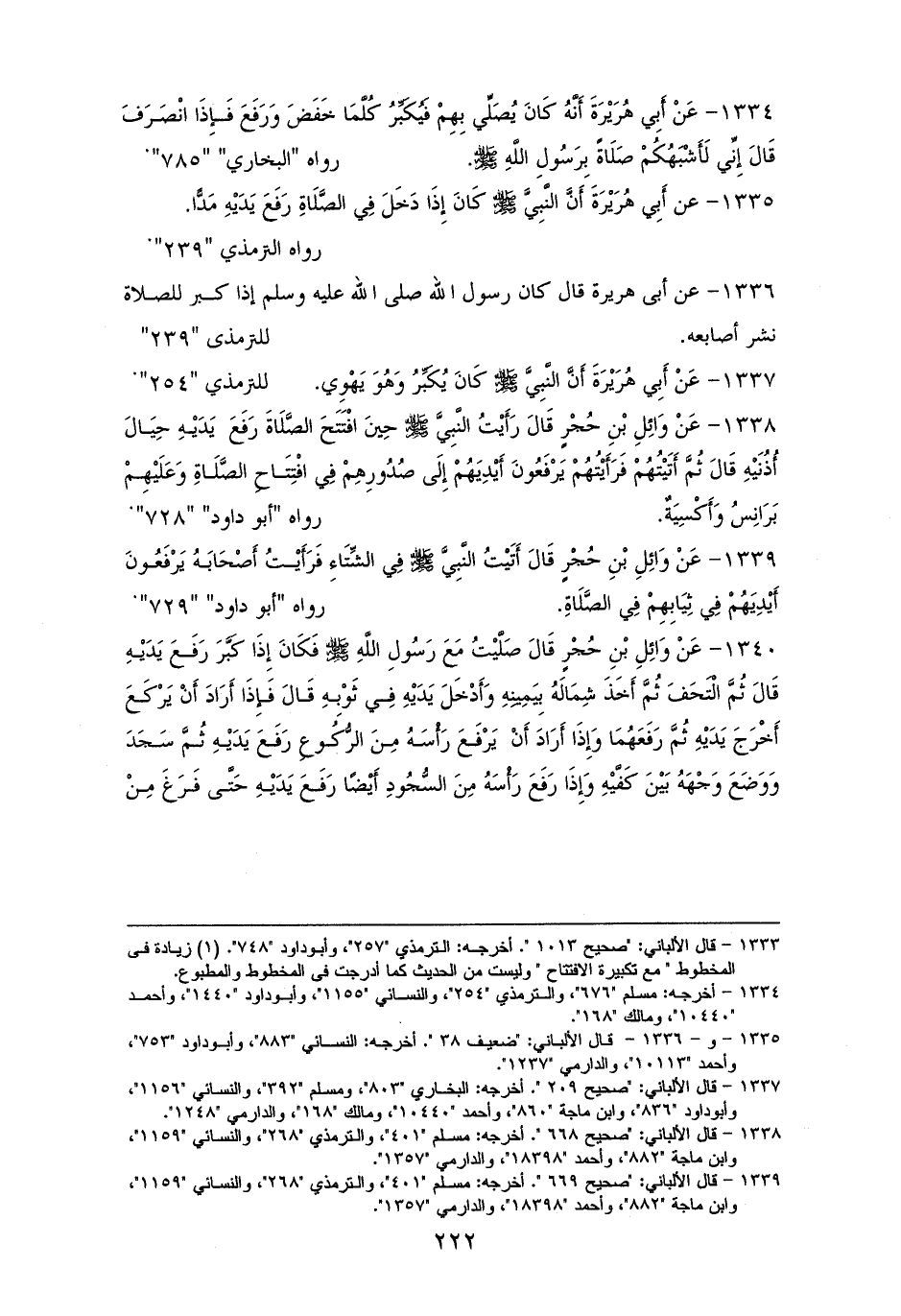 1338 - (وَائِلِ بْنِ حُجْرٍ) رَأَيْتُ النَّبِيَّ - صلى الله عليه وسلم - حِينَ افْتَتَحَ الصَّلَاةَ، رَفَعَ يَدَيْهِ حِيَالَ أُذُنَيْهِ، ثُمَّ أَتَيْت المدينة بعد، فَرَأَيْتُهُمْ يَرْفَعُونَ أَيْدِيَهُمْ إِلَى صدُورِهِمْ فِي افْتِتَاحِ الصَّلَاةِ، وَعَلَيْهِمْ بَرَانِسُ وَأَكْسِيَةٌ (¬1).