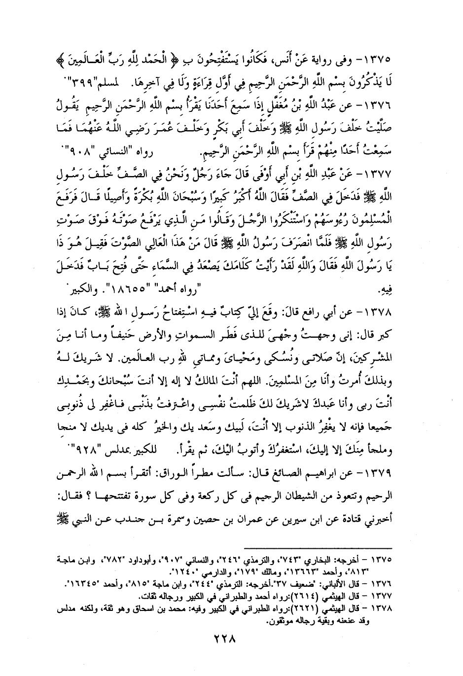 1378 - (أبو رافع) قالَ: وقَعَ إليّ كِتابٌ فيهِ اسْتِفتاحُ رَسولِ الله - صلى الله عليه وسلم -، كانَ إذا كبرَّ قالَ: إنِّي وجهتُ وجْهىَ للذي فَطَرَ السمواتِ والأرضَ حَنيفاً وما أنا مِنَ المشْرِكينَ، إنّ صلاتي ونُسُكي ومحياي ومماتي للهِ رب العالَمين، لا شَريكَ لهُ وبذلكَ أُمرتُ وأنَا مِنَ المسْلمِينَ، اللهم أنْتَ المالكُ لا إلهَ إلا أنتَ سُبْحانكَ وبحَمْدِك، أنْتَ ربى وأنا عَبدكَ لا شَريكَ لكَ ظَلمتُ نفْسِي، واعْترفتُ بذَنْبي، فاغْفِر لي ذُنوبِي جَميعًا، فإنه لا يغْفِرُ الذنوبَ إلا أنْتَ، لَبيكَ وسَعديكَ والخيرُ في يديكَ لا منجا ولا ملجأ مِنَكَ إلا إليكَ، اسْتغِفرُكَ وأتوبُ اليْكَ، ثم يقْرأ. للكبيرِ بمدلسٍ (¬1).