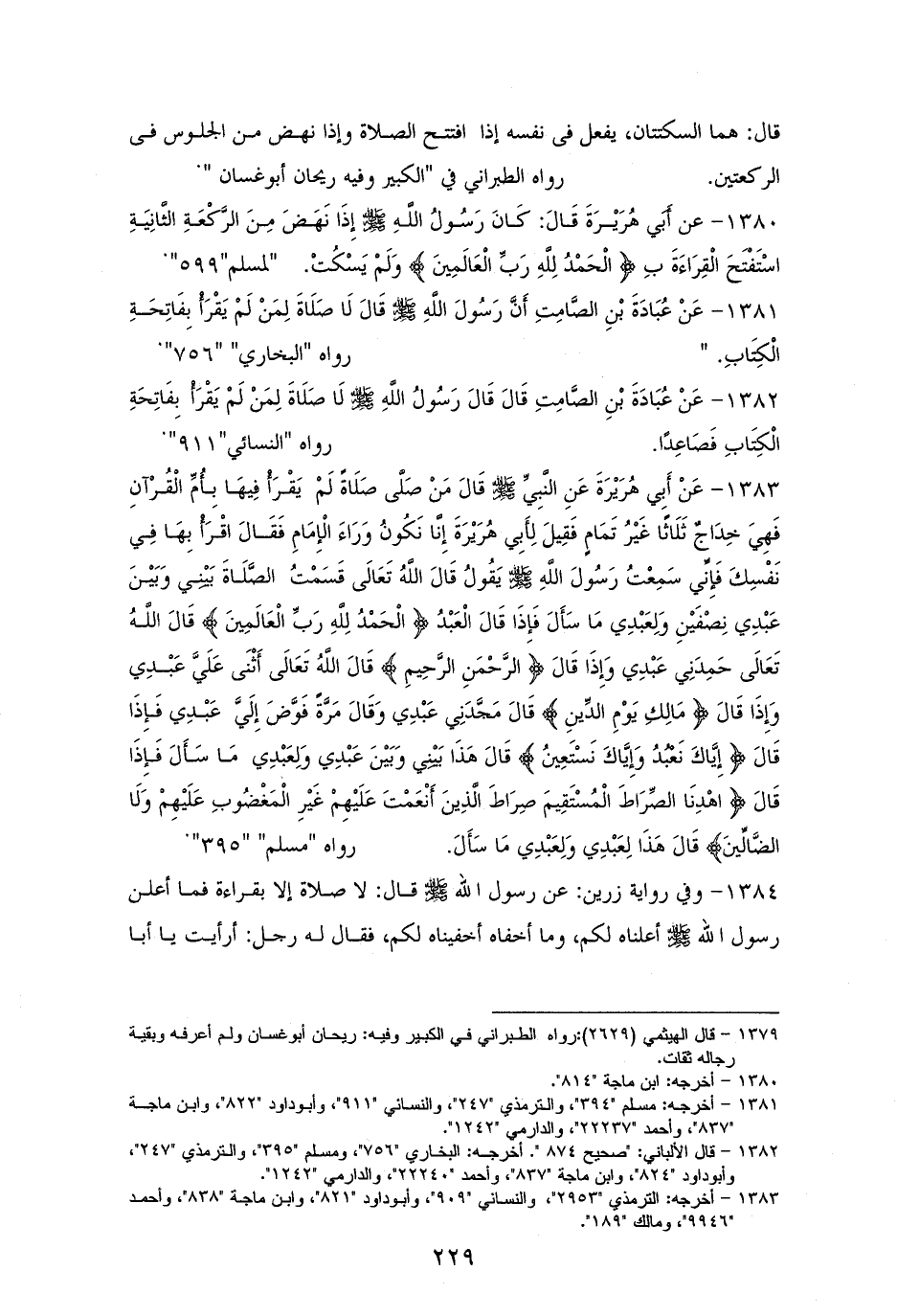 1381 - (عُبَادَةَ بْنِ الصَّامِتِ) رفعه: ((لَا صَلَاةَ لِمَنْ لَمْ يَقْرَأْ بِفَاتِحَةِ الْكِتَابِ)). للستةِ إلا مالكًا (¬1).