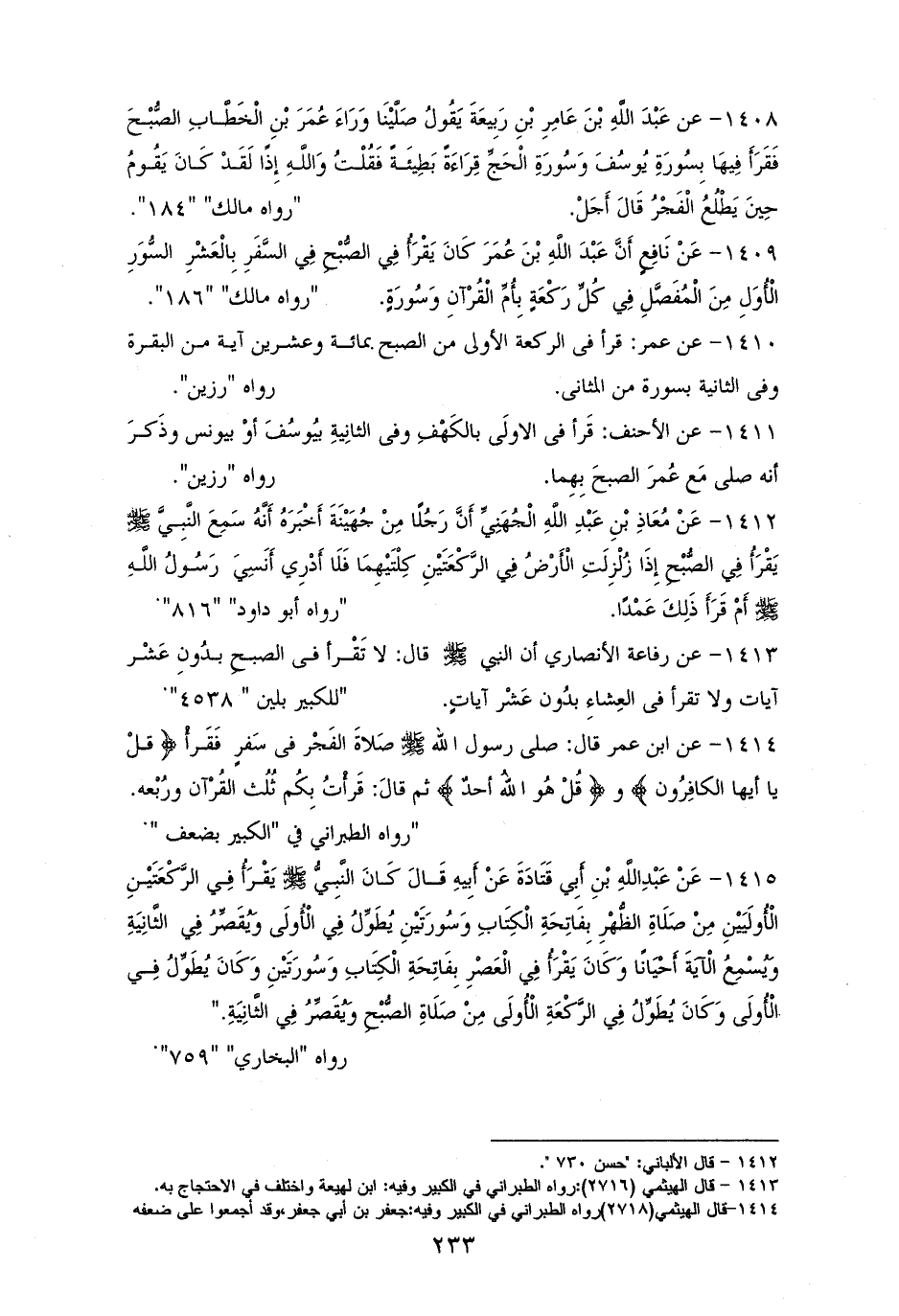 1410 - (عمر): قرأ في الرَّكعة الأولى من الصبح بمائةٍ وعشرينَ آيةٍ من البقرةِ، وفى الثانيةِ بسورةٍ من المثانى (¬1).