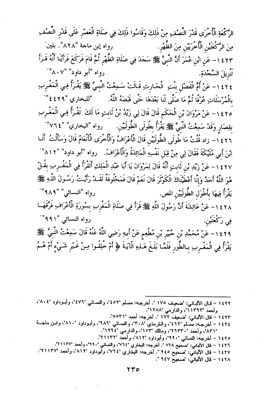 1425 - مَرْوَان بْنِ الْحَكَمِ قَالَ لِي زَيْدُ بْنُ ثَابِتٍ مَا لَكَ تَقْرَأُ فِي الْمَغْرِبِ بِقِصَار المفصل وَقَدْ سَمِعْتُ النَّبِيَّ - صلى الله عليه وسلم - يَقْرَأُ [بِطُولي] (¬1) الطُّولَيَنِ؟ للبخاريِّ، والنسائيِّ، وأبي داودَ (¬2).